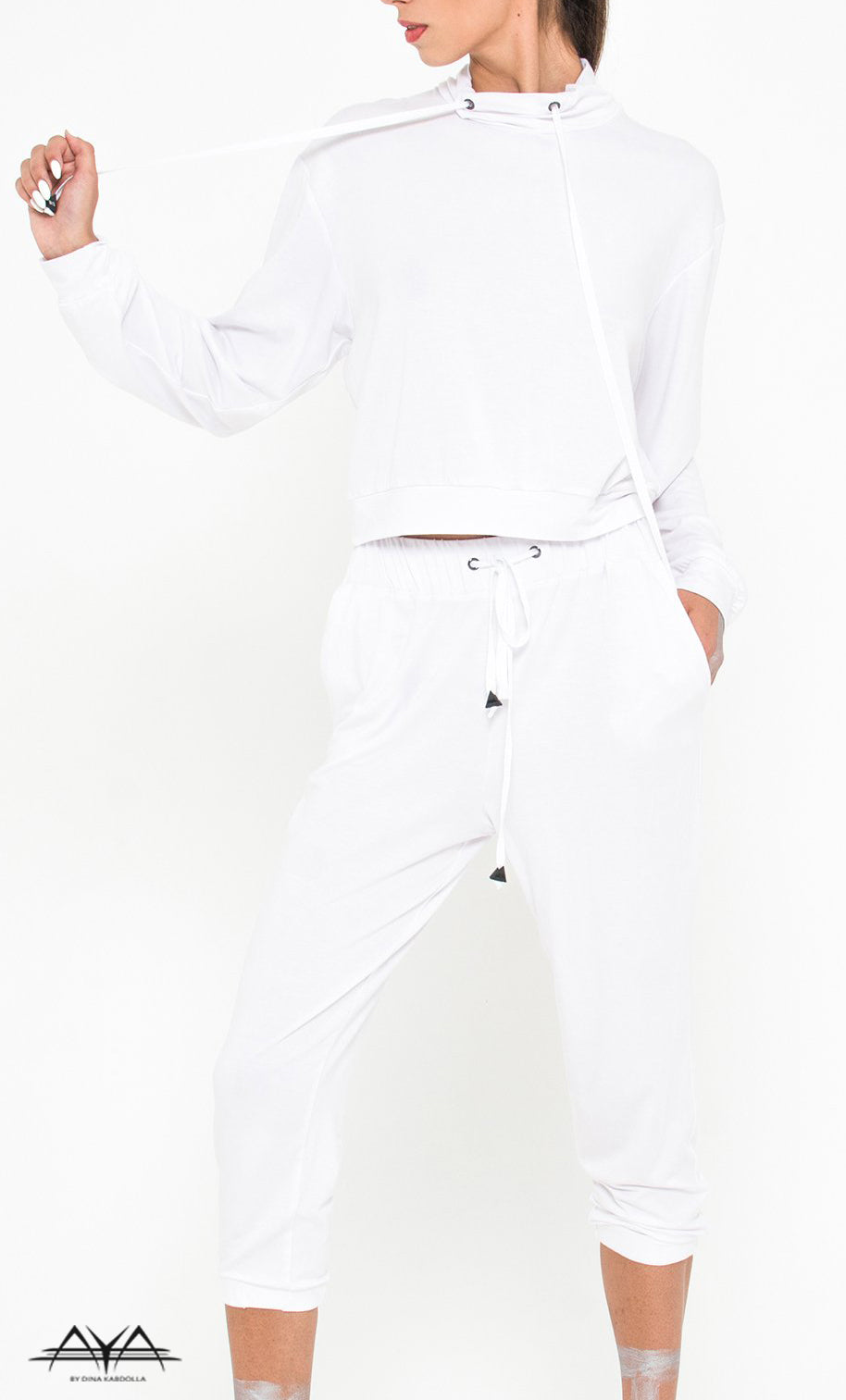 Keep it cool & casual! Your daily All White set featuring drop crotch pant with long neck hoodie shirt is all type of occasion look is ready to go! Absolutely stunning quality of fabric will leave your days at ease! Easy, voguish, feel the comfort with AyA!