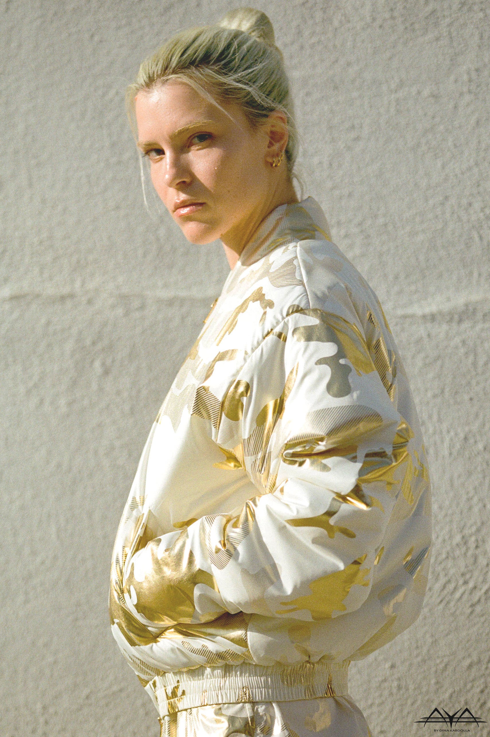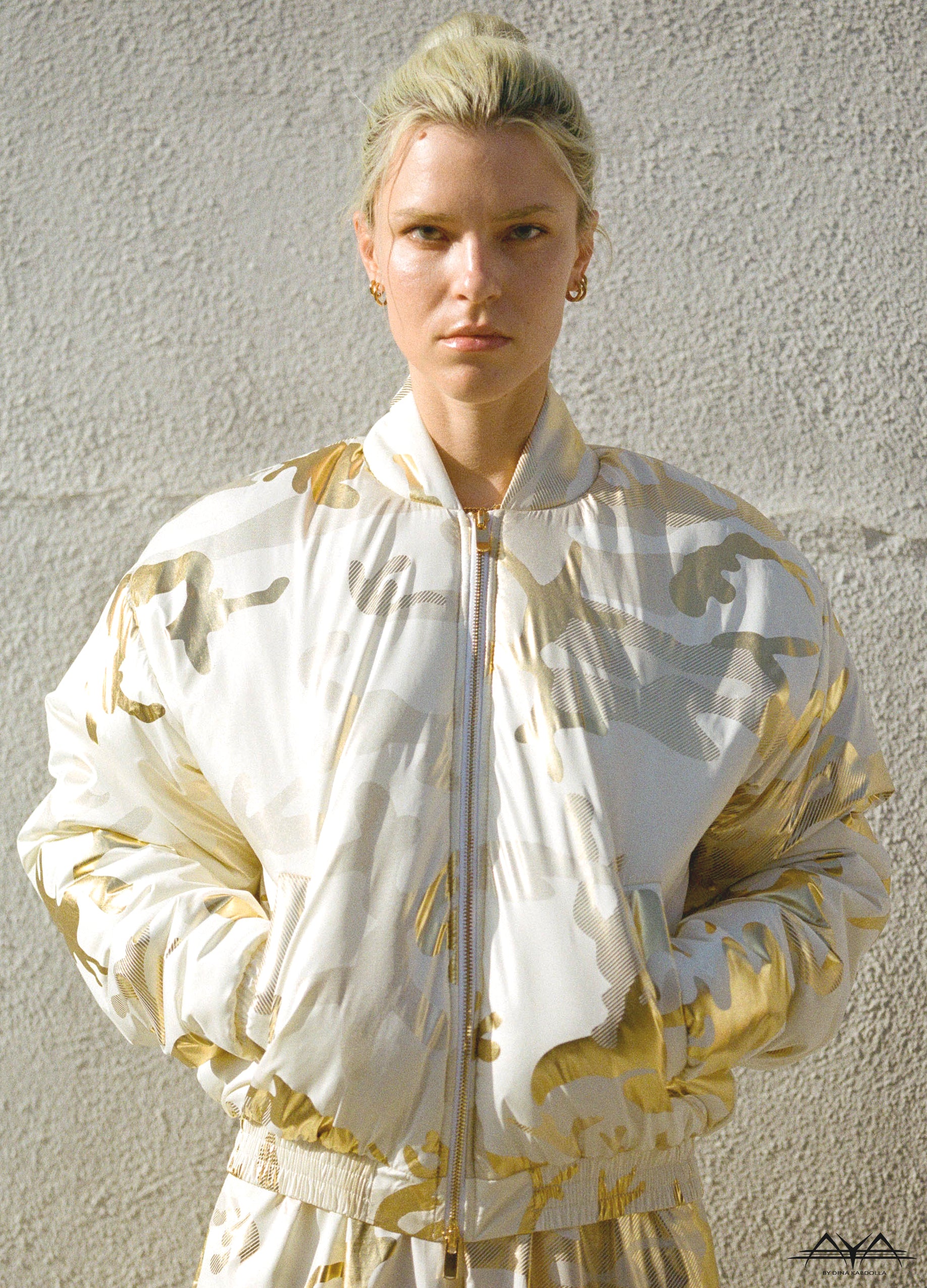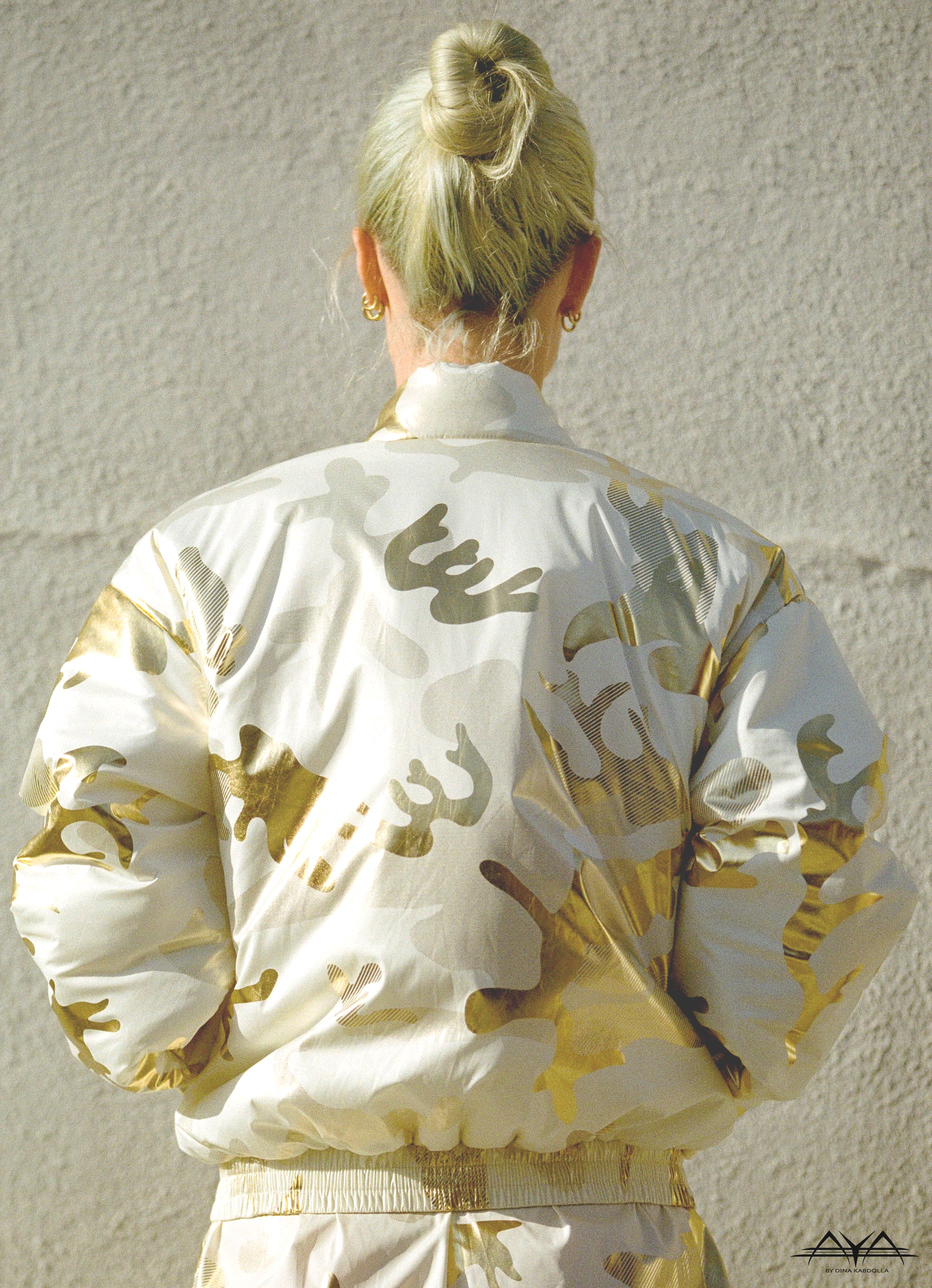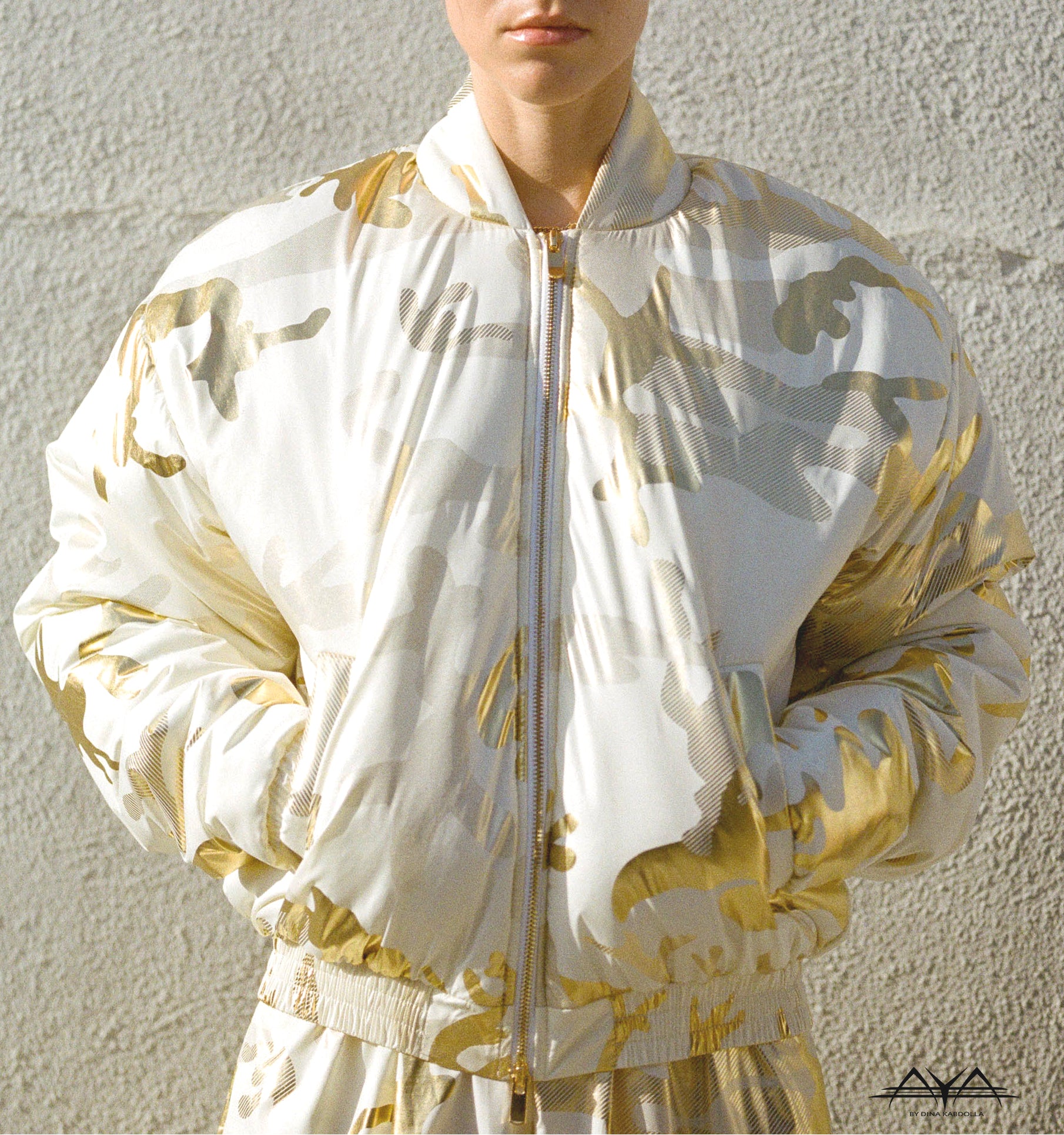 Your essential "throw on" daily jacket with some shinny patterns on, makes it more chic for your daily use. This AyA's signature white/gold camouflage pattern in your wardrobe can change game just like it changed for Young Dolph. Spotted our AyA's jackets in Young Dolph video clip Water On Water, stay tuned! Featuring elasticated hem with side pockets, double layered with polyester batting to keep you warm in coolest autumn. Model is wearing size S/M, true to size, unisex design.