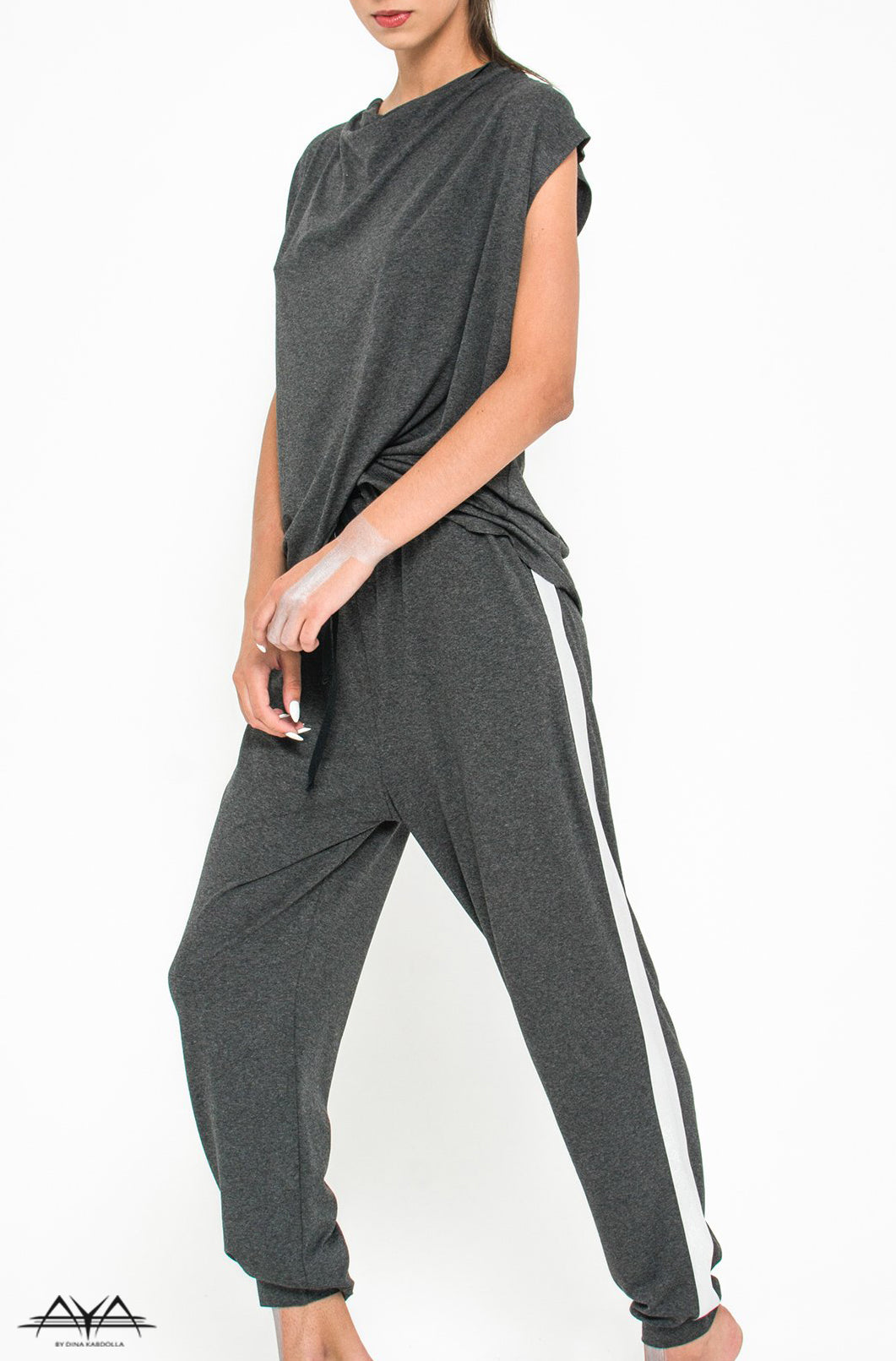 Work styled simplicity into your everyday wardrobe with this co-ord set. Featuring drop crotch pants with sleeveless top featuring metallic silver strap for a complete look! Easy, stylish feel the comfort with AyA!