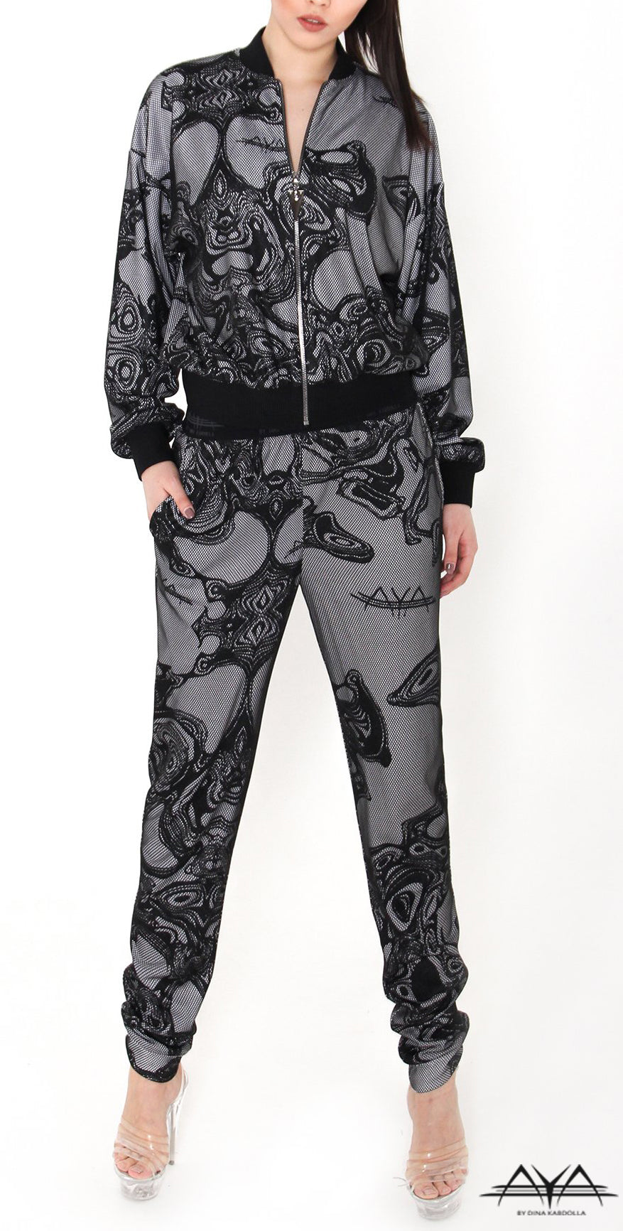 One of our favorite & Must Have sets from AyA's collection. Double layered fabric set features AYA's signature print comes with front mesh layer on top. This set is perfect for every season & for every occasion featuring front zipper bomber with ease fit pants. Easy to style with some high heels or kicks.