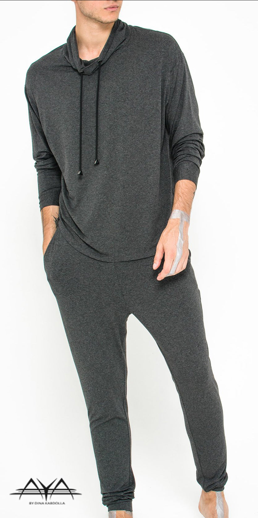We are obsessing over this unisex everyday casual set! This rich color and quality of the fabric is beyond any expectations. Featuring drop crotch pants with long neck hood shirt comes with signature metallic stopper. Easy, voguish, feel the comfort with AyA!