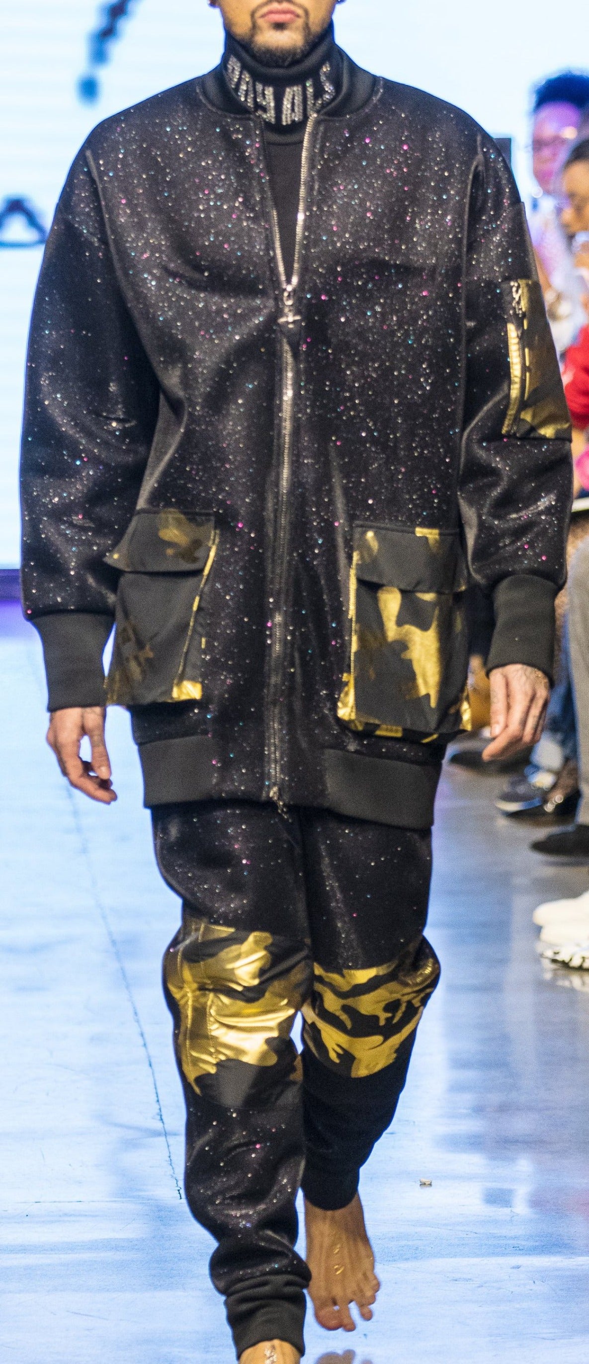 Look 4 is unisex set comes with oversized contrast camouflage pockets with front camouflage contrast pants. This edgy look has very clean and sharp triangle shapes of design which make up the DNA of AyA. The set combines tough fit form-sport through choice of fabrics. AyA' by Dina Kabdolla's signature is to give variety of styles in one look but always keep the active comfort. AyA's runway collection is combination of a bridge between comfort and Ethnic chic.