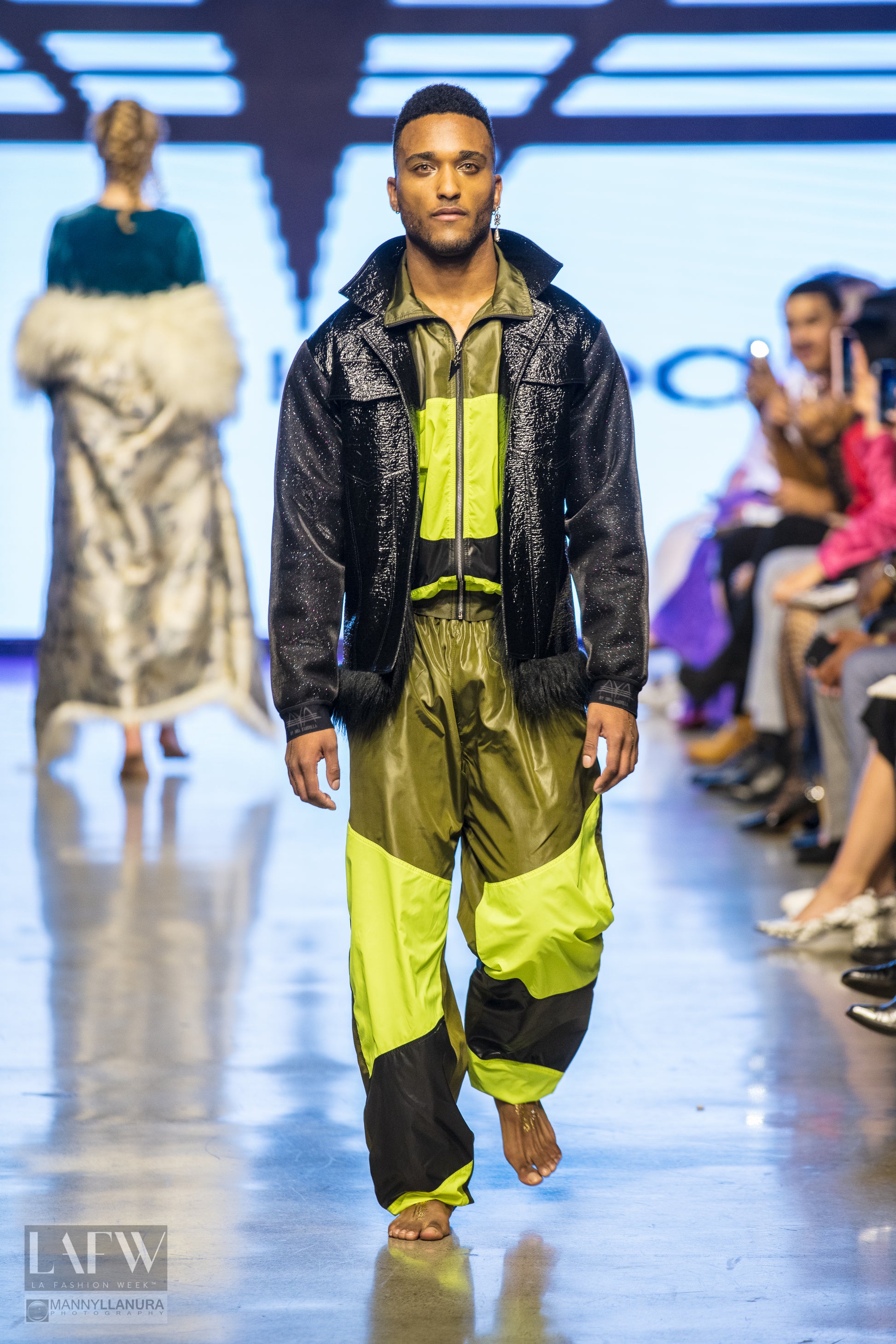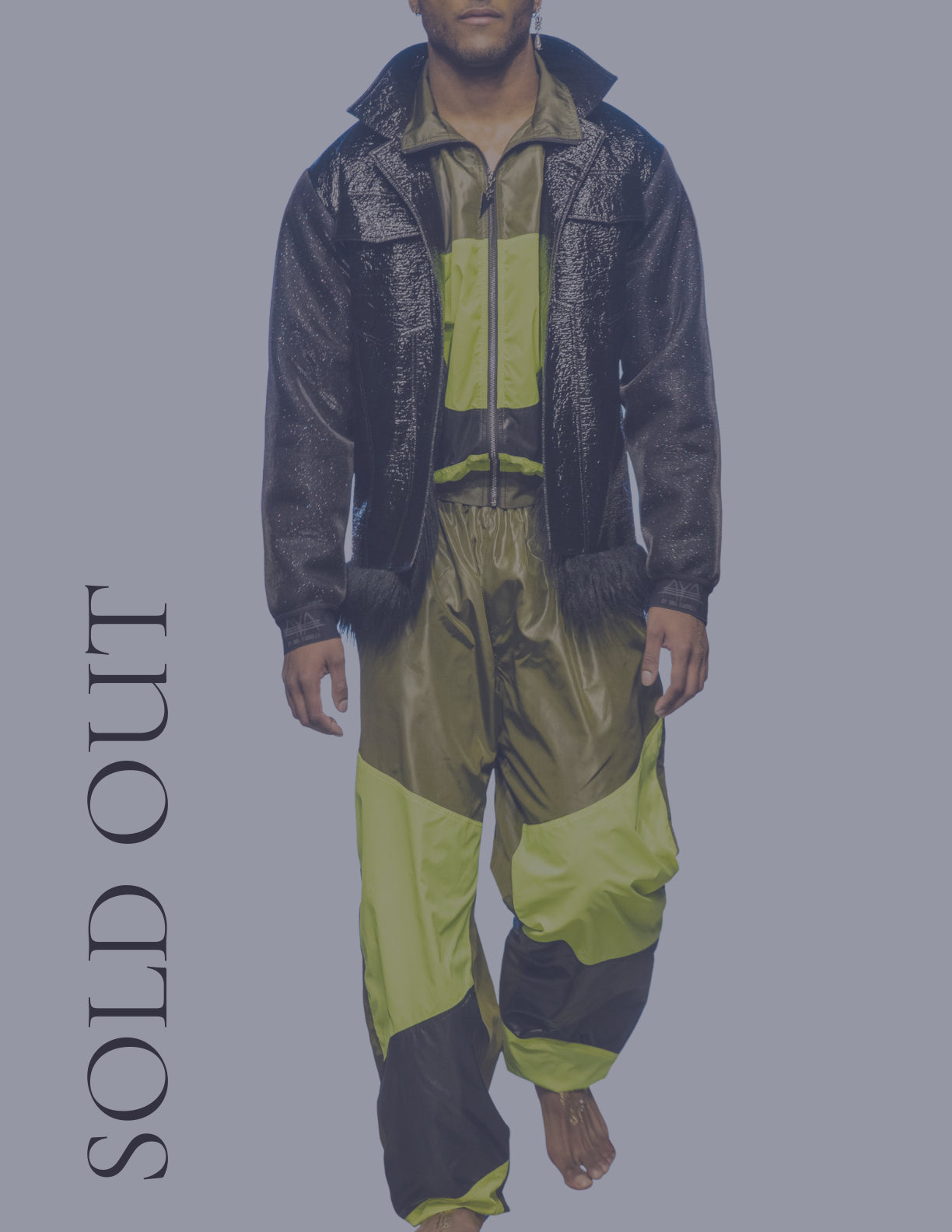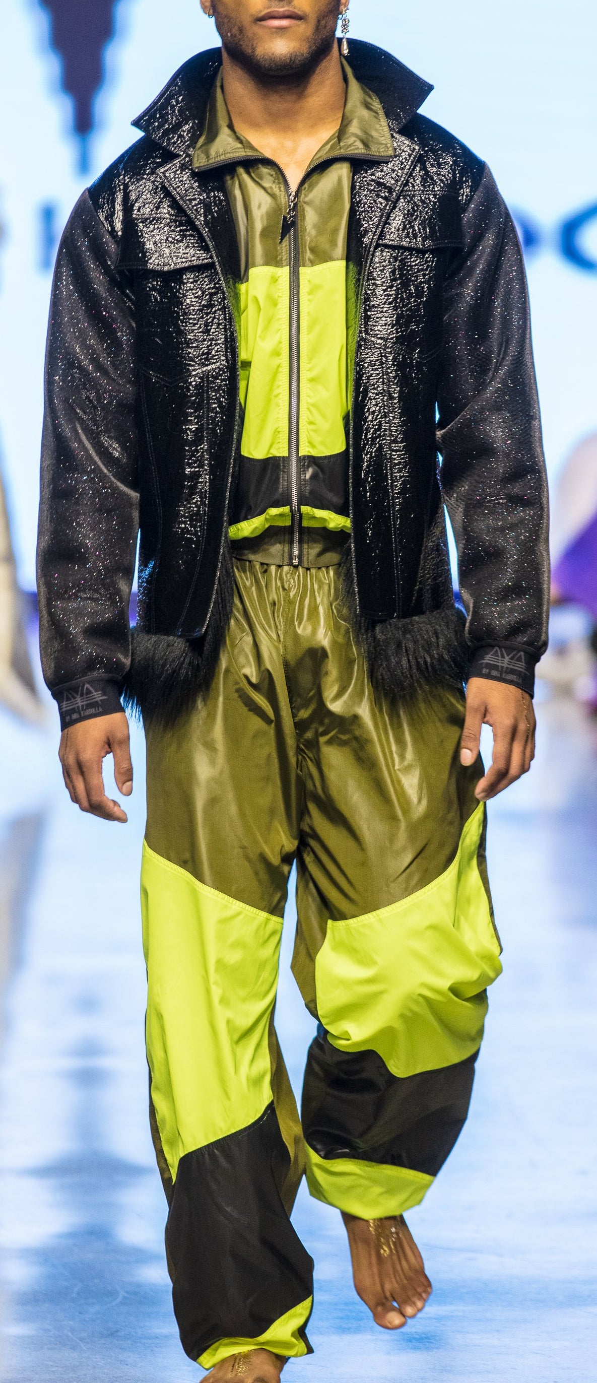 Look 20 AyA's signature glance "Oh, La 80th Track Suit" inspired by active, athlete, comfort indication sense of a brand. 'Must Have' comfort sport set paired with vinyl combined jacket. It is perfect for special occasions and this look exemplifies AyA’s vision of tailored streetwear. Blend between active, architectural, minimalistic silhouettes by adding a modern updated twist through the use of unique fabrics. AyA's runway collection is combination of a bridge between comfort and Ethnic chic.