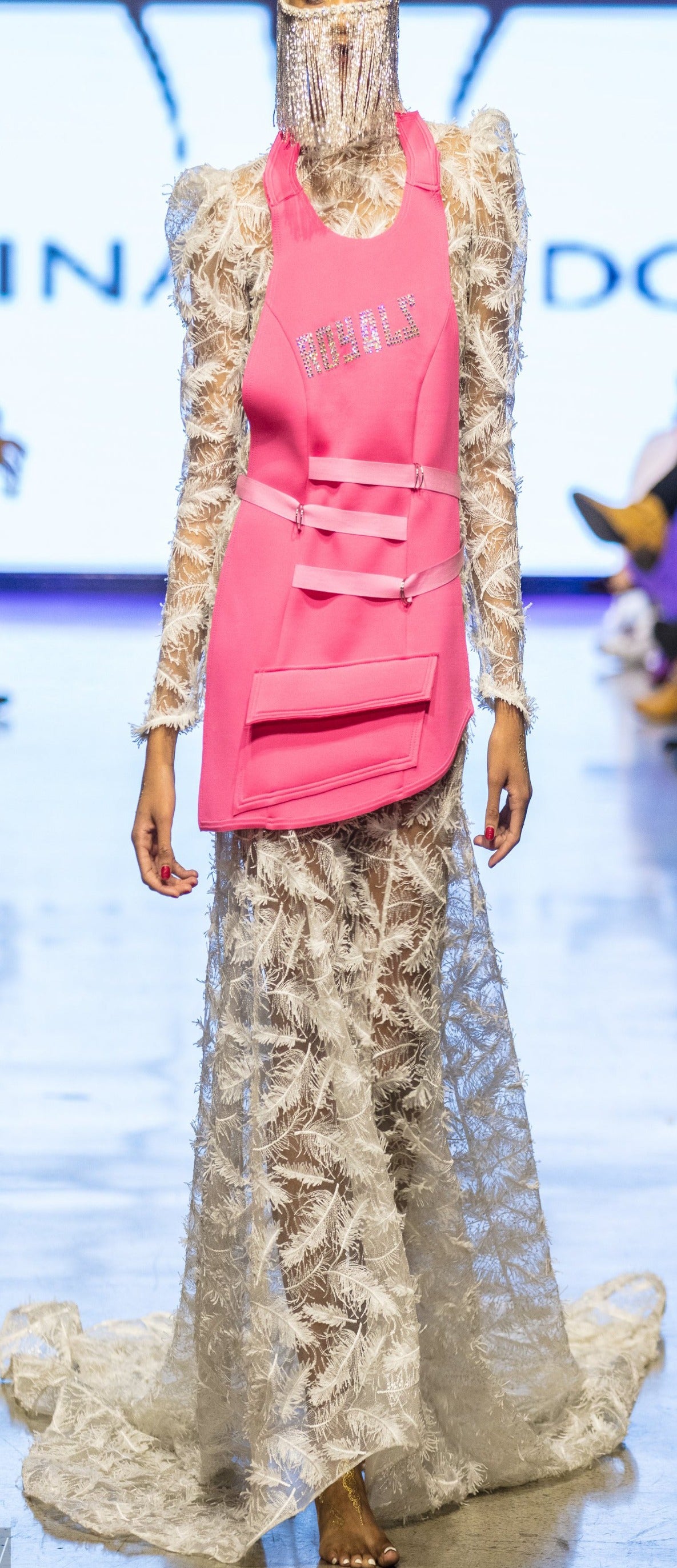 LOOK 29 One of the most remarkable glance from AyA's Runway collection, where AyA’s vision of tailored chic, streetwear, ethnic luxury meets each others in one look. Silk see through, feathered dress with flashlight sleeve paired with front pink apron with large pockets at the front featuring special hand made finish out of Swarovski Stone, AyA’s blend between active, architectural, minimalistic silhouettes by adding a modern updated twist through the use of unique fabrics. AyA' by Dina Kabdolla's runway collection is combination of a bridge between comfort and Ethnic chic. The most significant combination of glam, luxe, elegance, active, comfort and chic in one silhouettes in a glance and vision of new generation designer.
