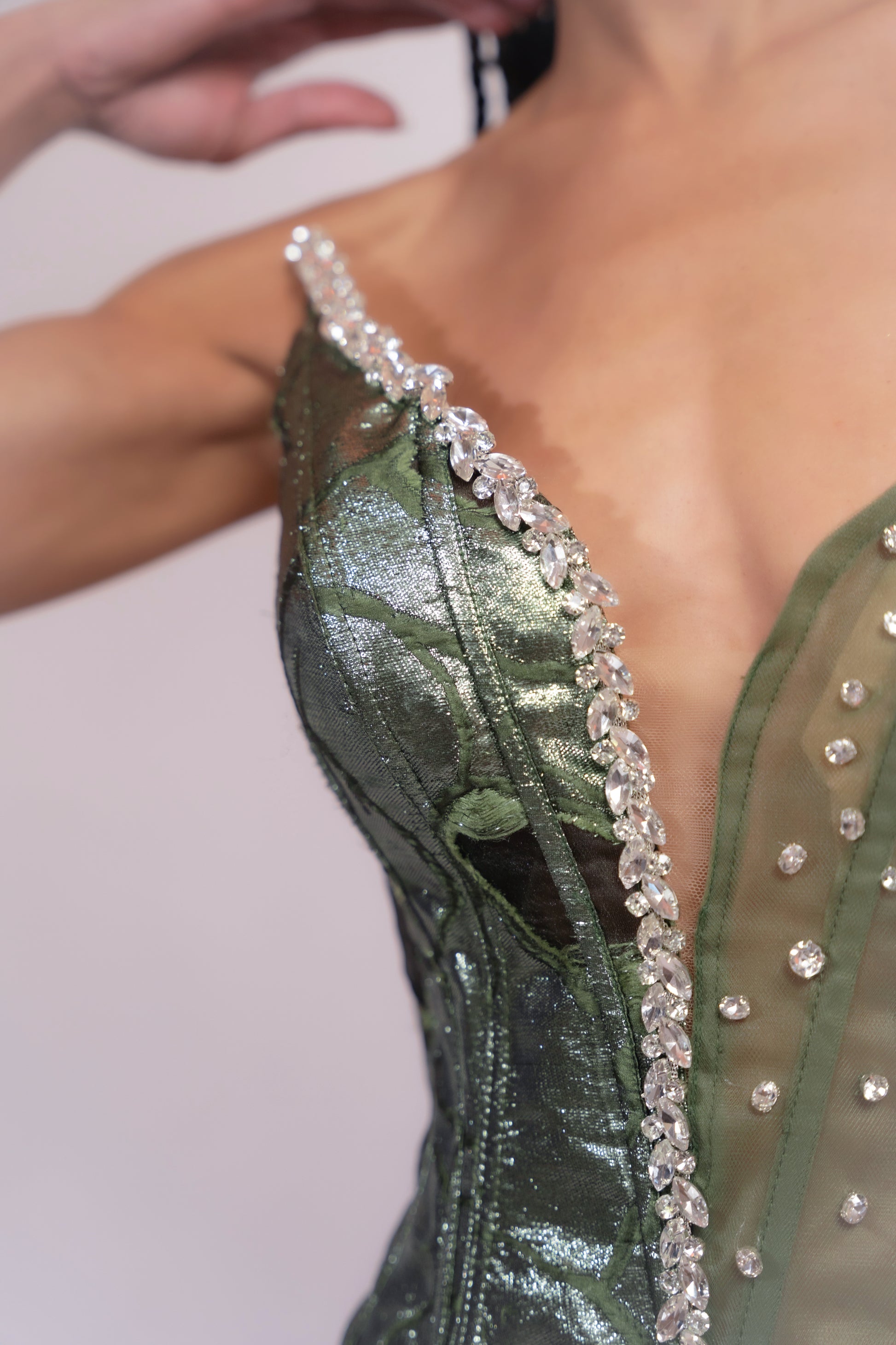 - Premium Materials:Crafted with exclusive fabrics and hand-applied crystal embellishments for an unparalleled couture finish. Silk brocade with novelty metallic thread.