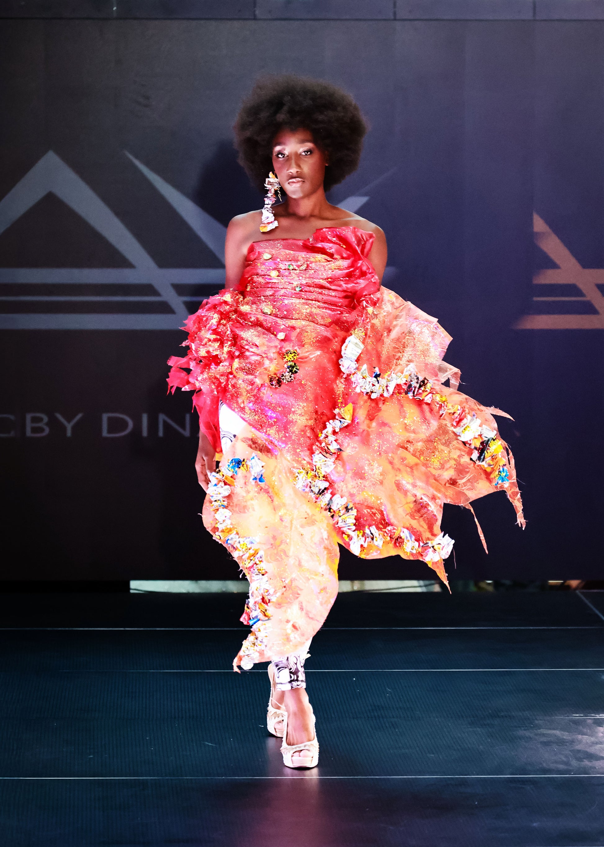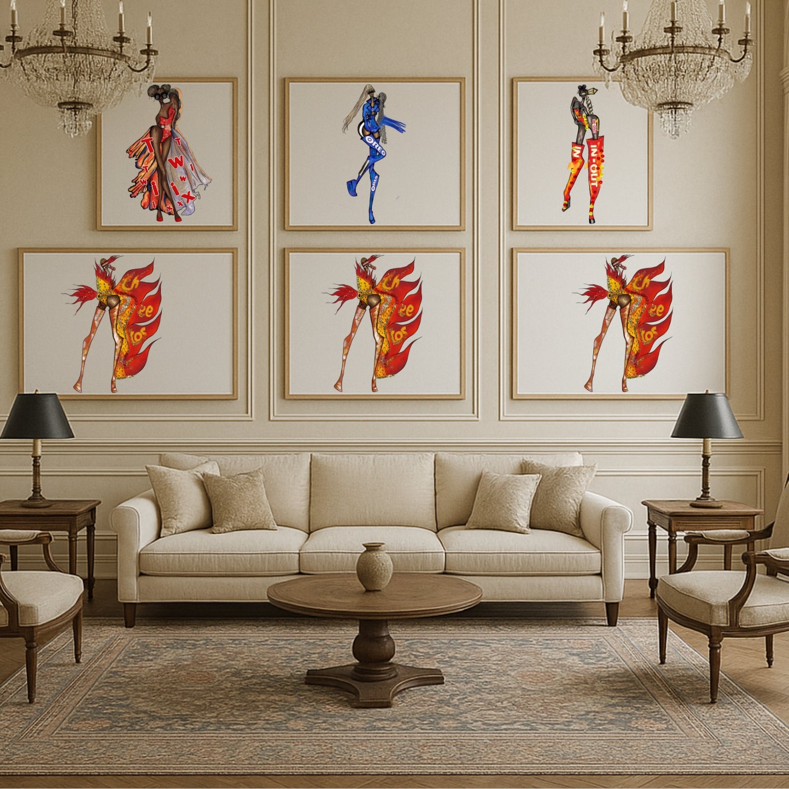 This original mixed-media work features a hand-drawn couture illustration by Dina Kabdolla, styled in an explosive gown made from authentic Cheetos snack packaging. Each wrapper is hand-cut, crumpled, and sculpted into dynamic folds that evoke flames and motion, symbolizing Cheeta’s fierce spirit. The deep reds and vibrant yellows are intensified with gold dust and shimmering accents, creating a piece that demands attention.