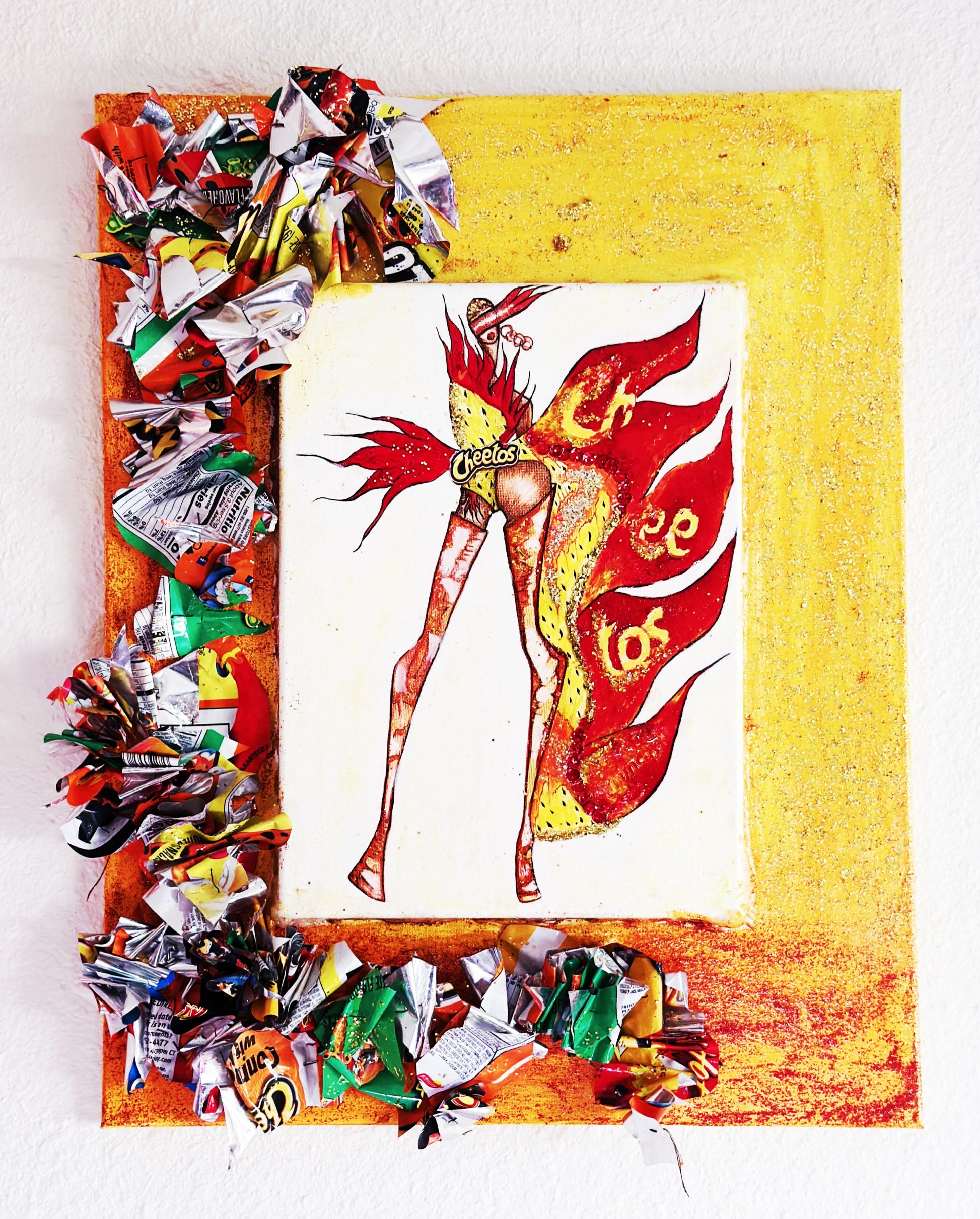 The border of the artwork extends her fire beyond the figure — recycled Cheetos bags are folded into angular bursts and embedded into a textured, glitter-kissed surface, making the frame as much a part of the art as the illustration itself.