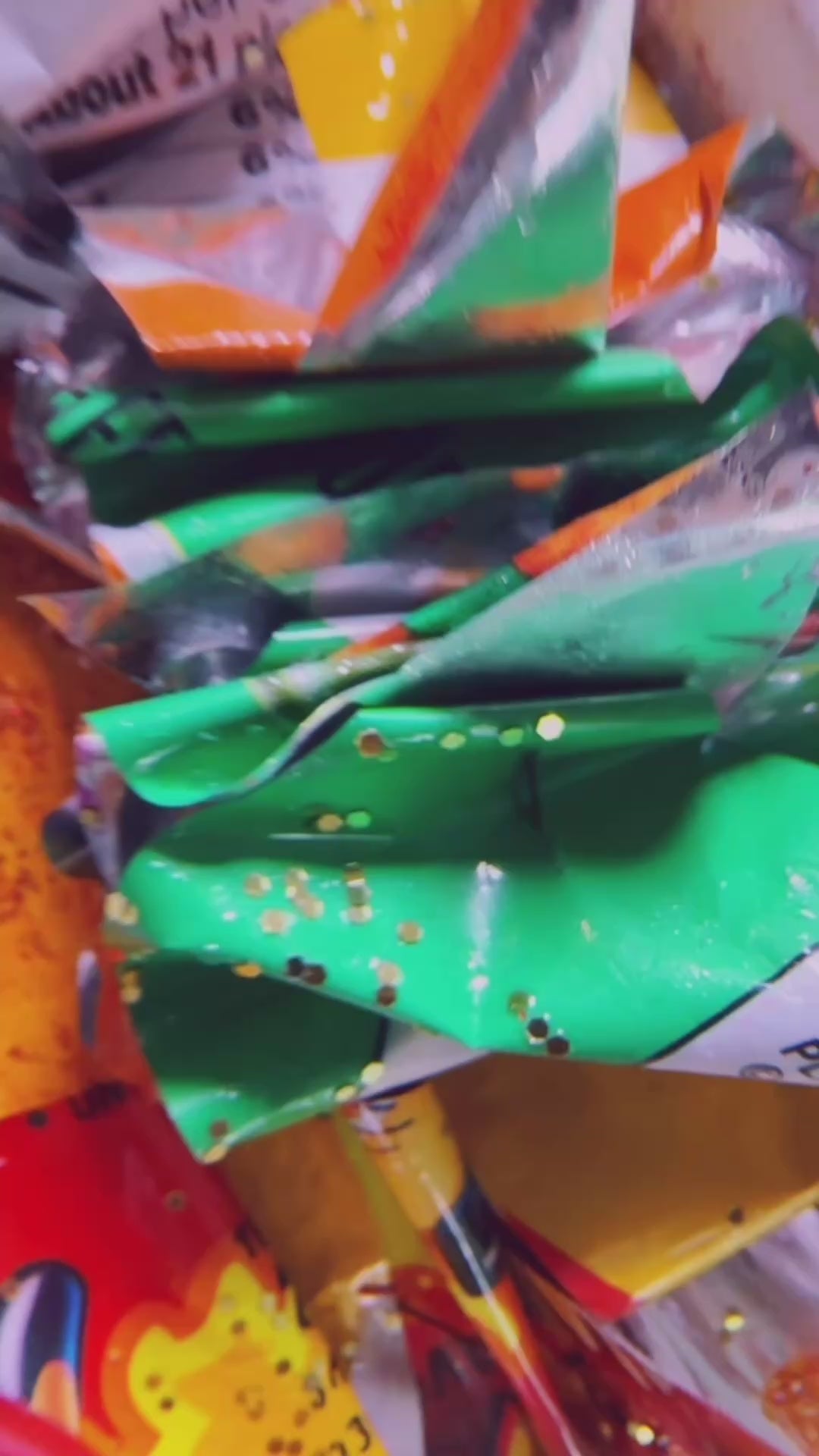 - Mixed media: acrylic, glitter, metallic pigments, recycled snack packaging