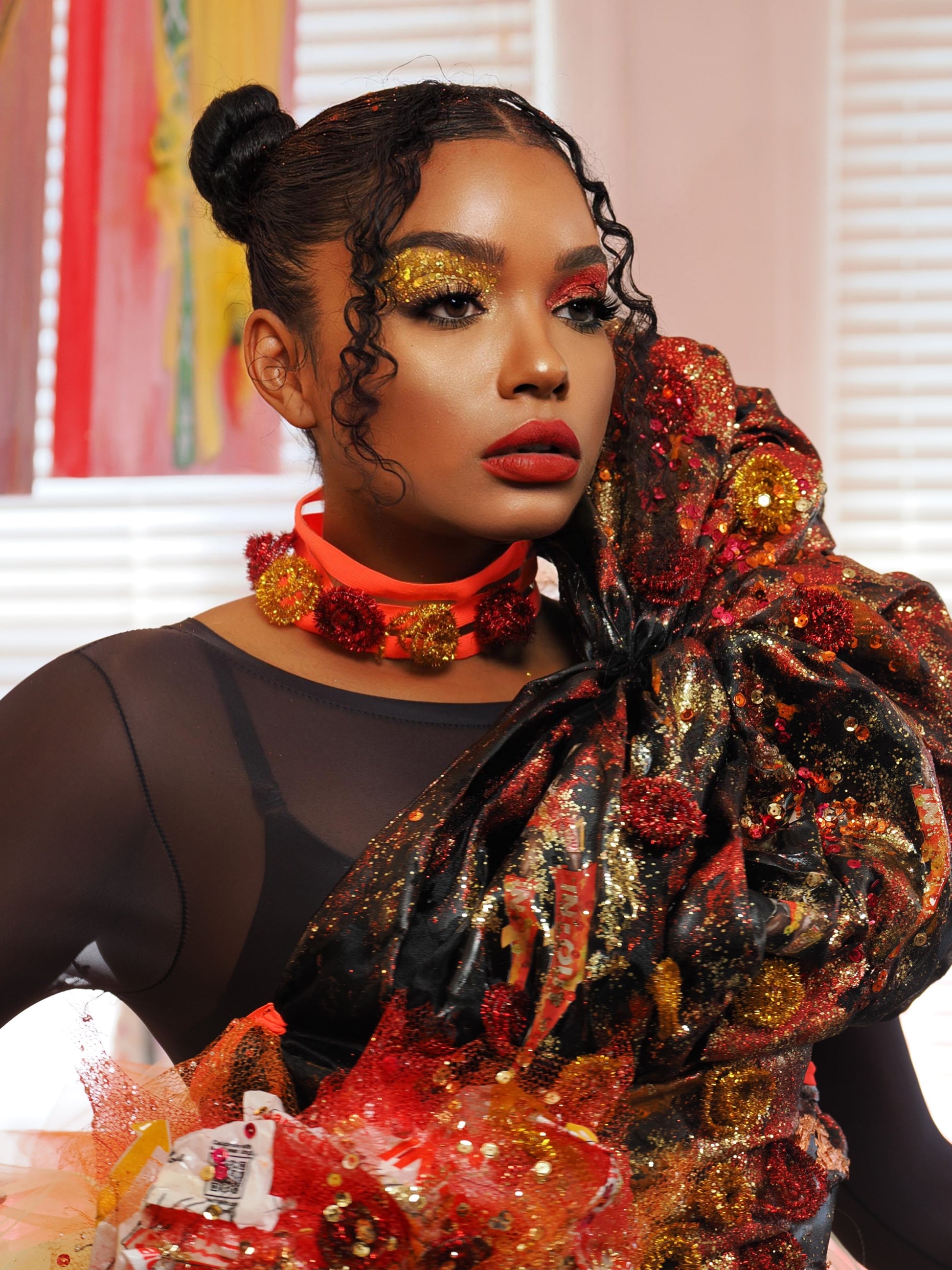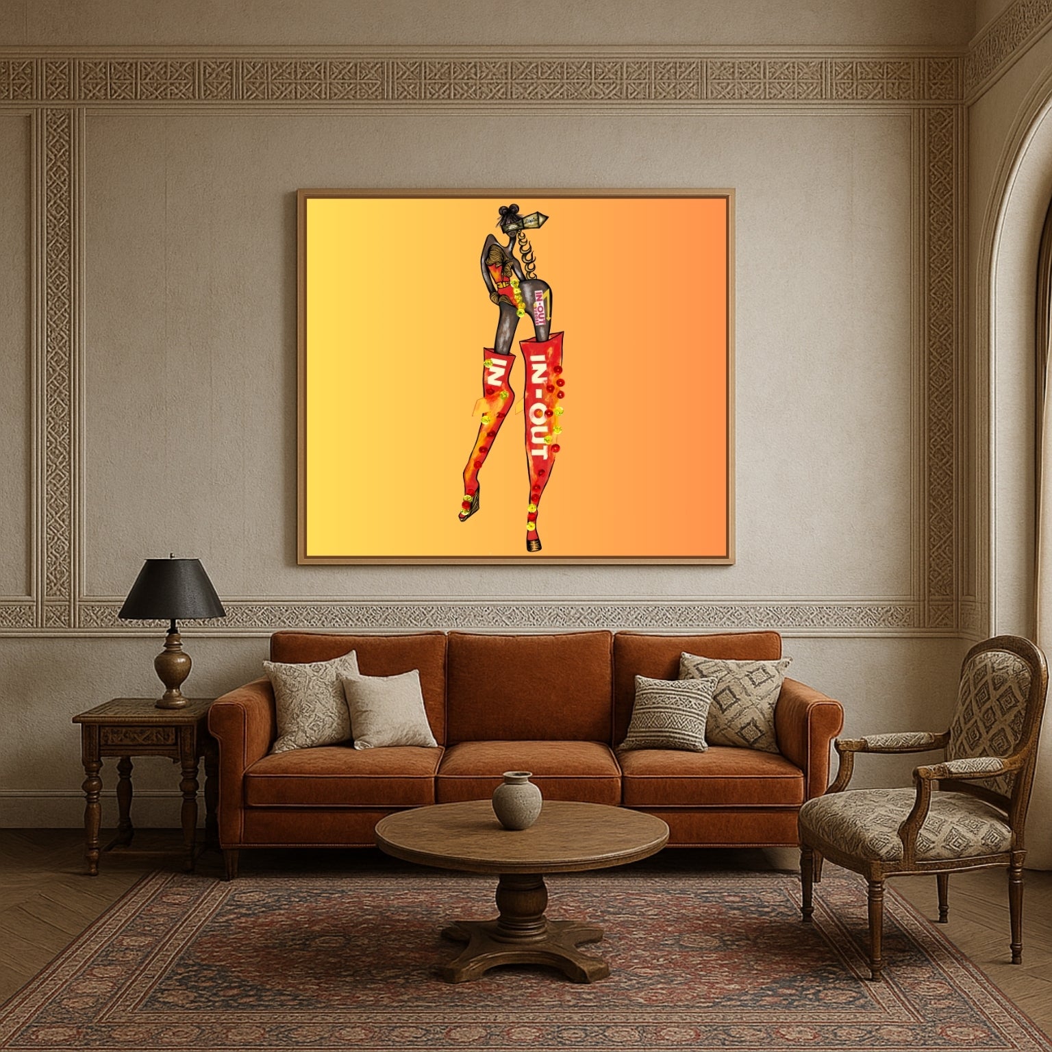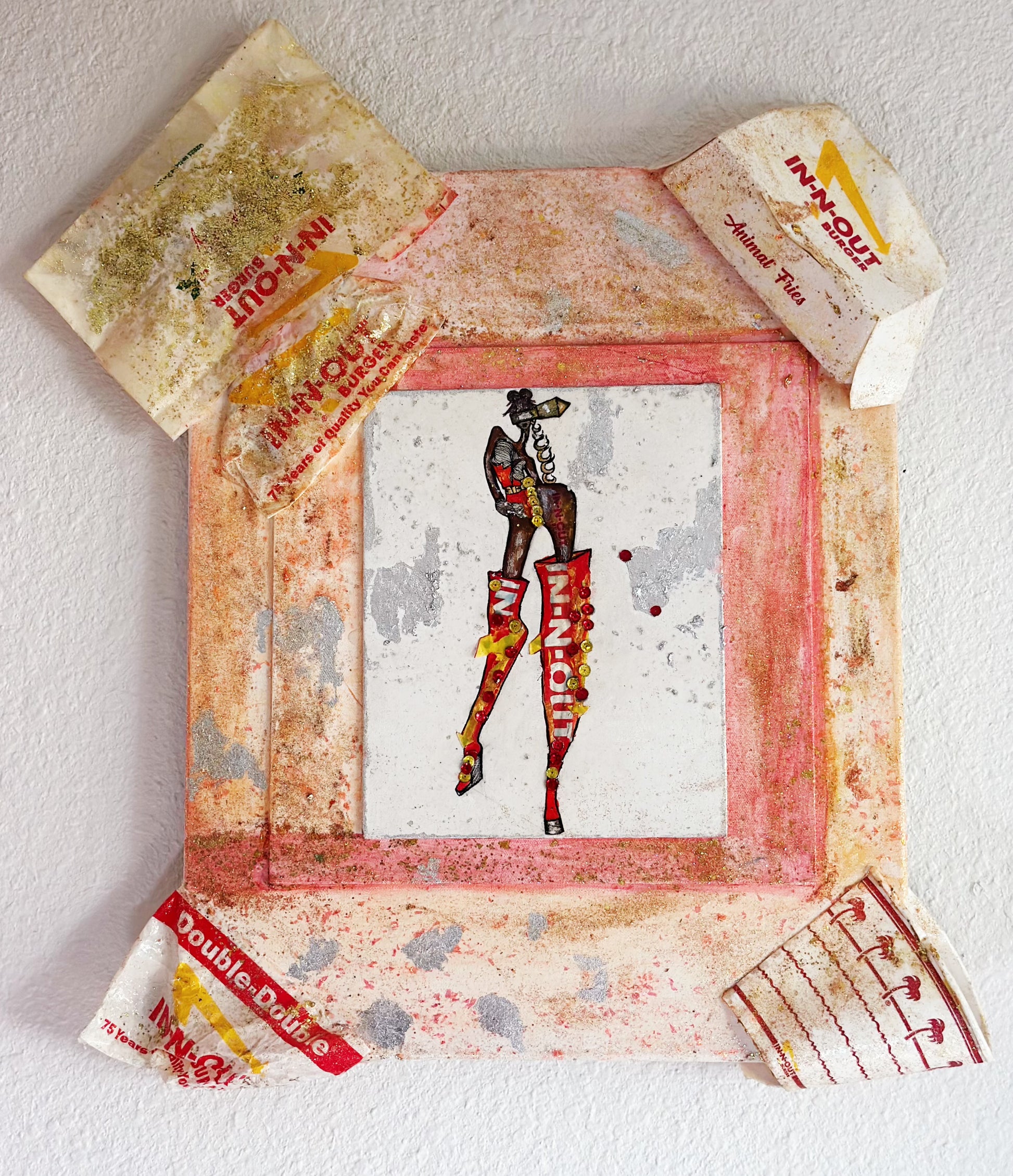 This original mixed-media work features a hand-drawn couture illustration by Dina Kabdolla, styled in a bold ensemble crafted from authentic In-N-Out Burger packaging. Every wrapper, fry sleeve, and cup graphic has been hand-cut, shaped, and embedded into the design, with select pieces aged and layered to create depth and texture. Gold and silver accents blend with warm reds and yellows, symbolizing vitality and abundance.