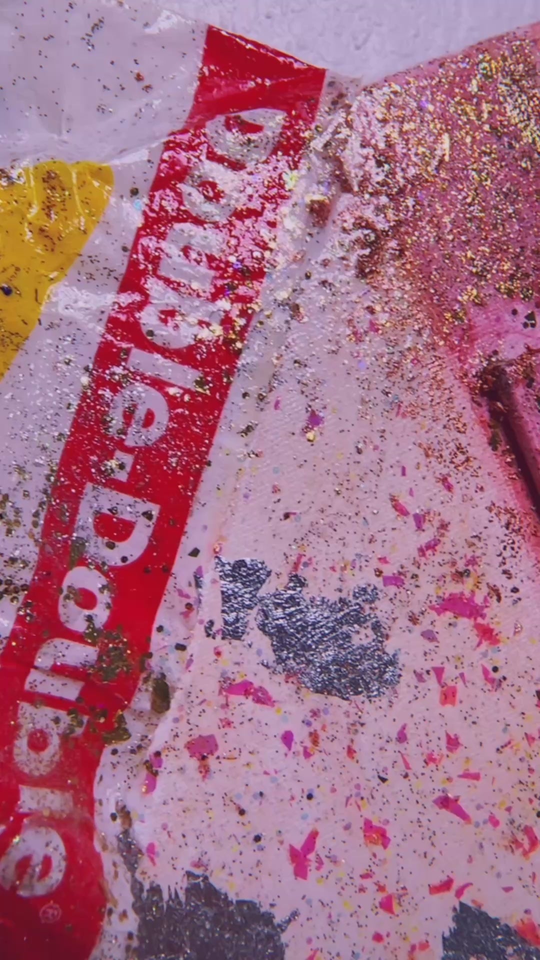 - Mixed media: acrylic, glitter, metallic pigments, recycled fast-food packaging