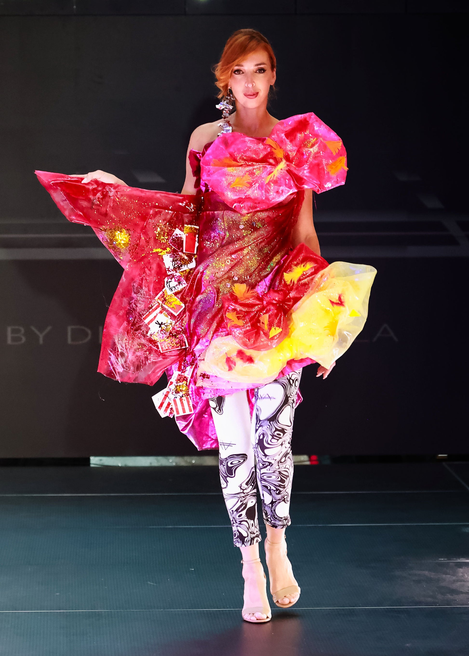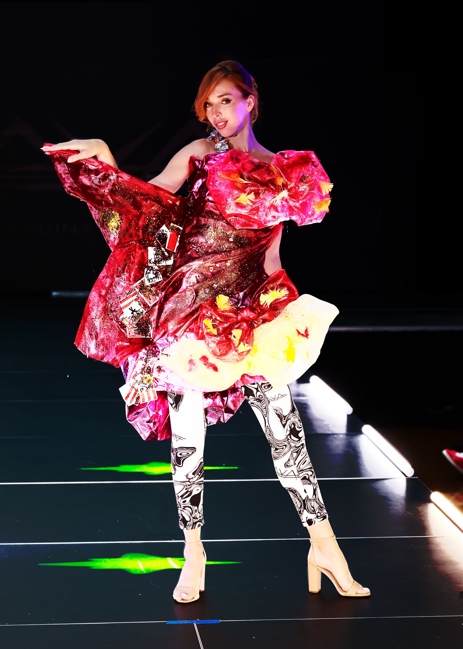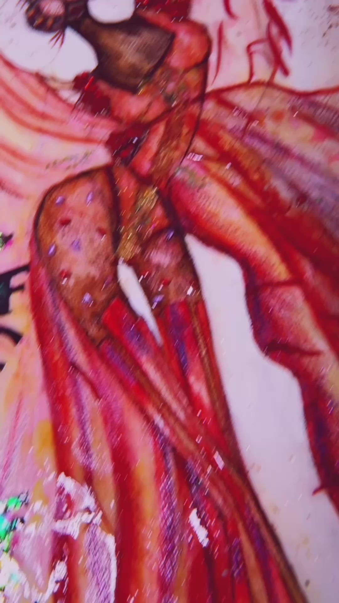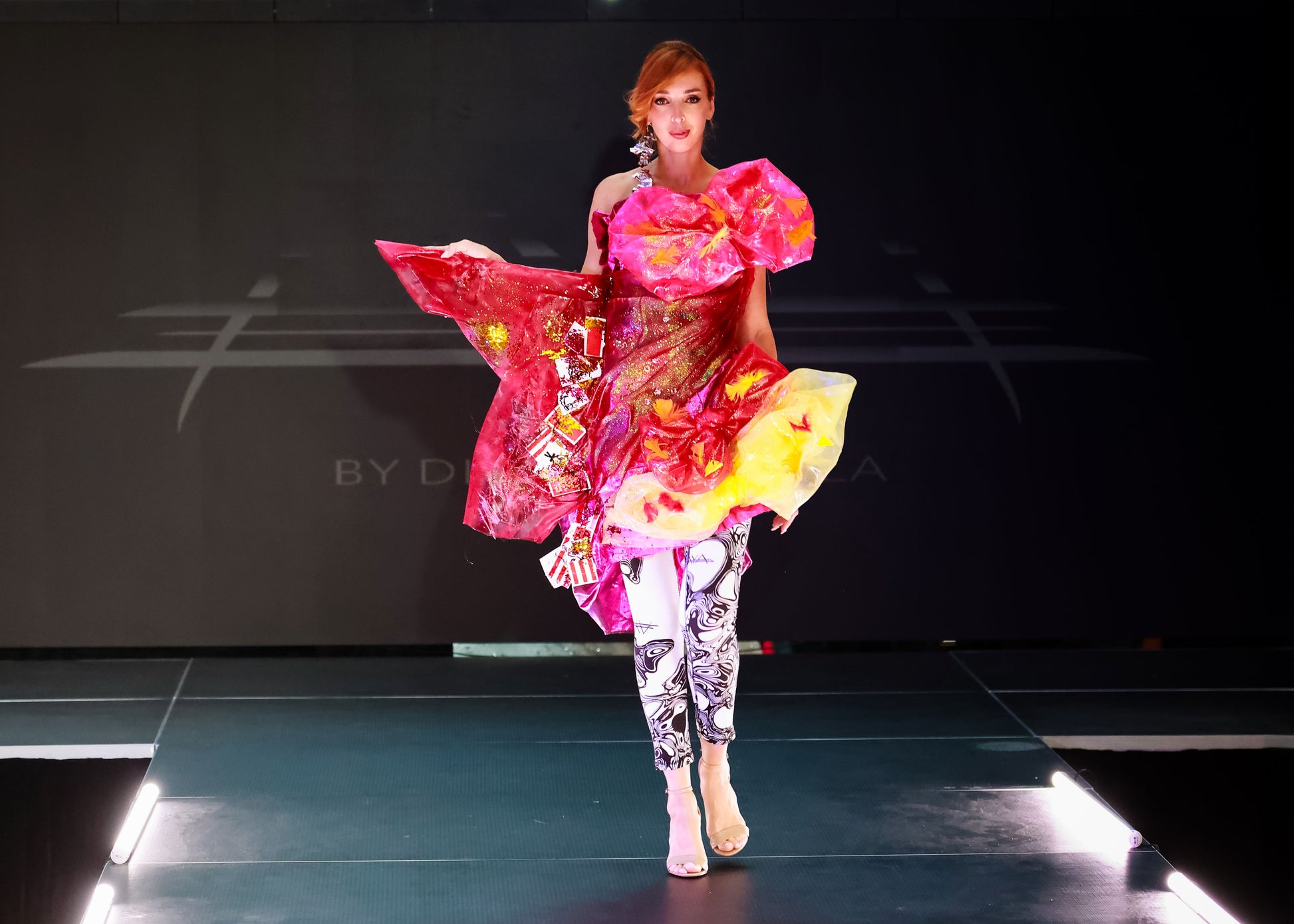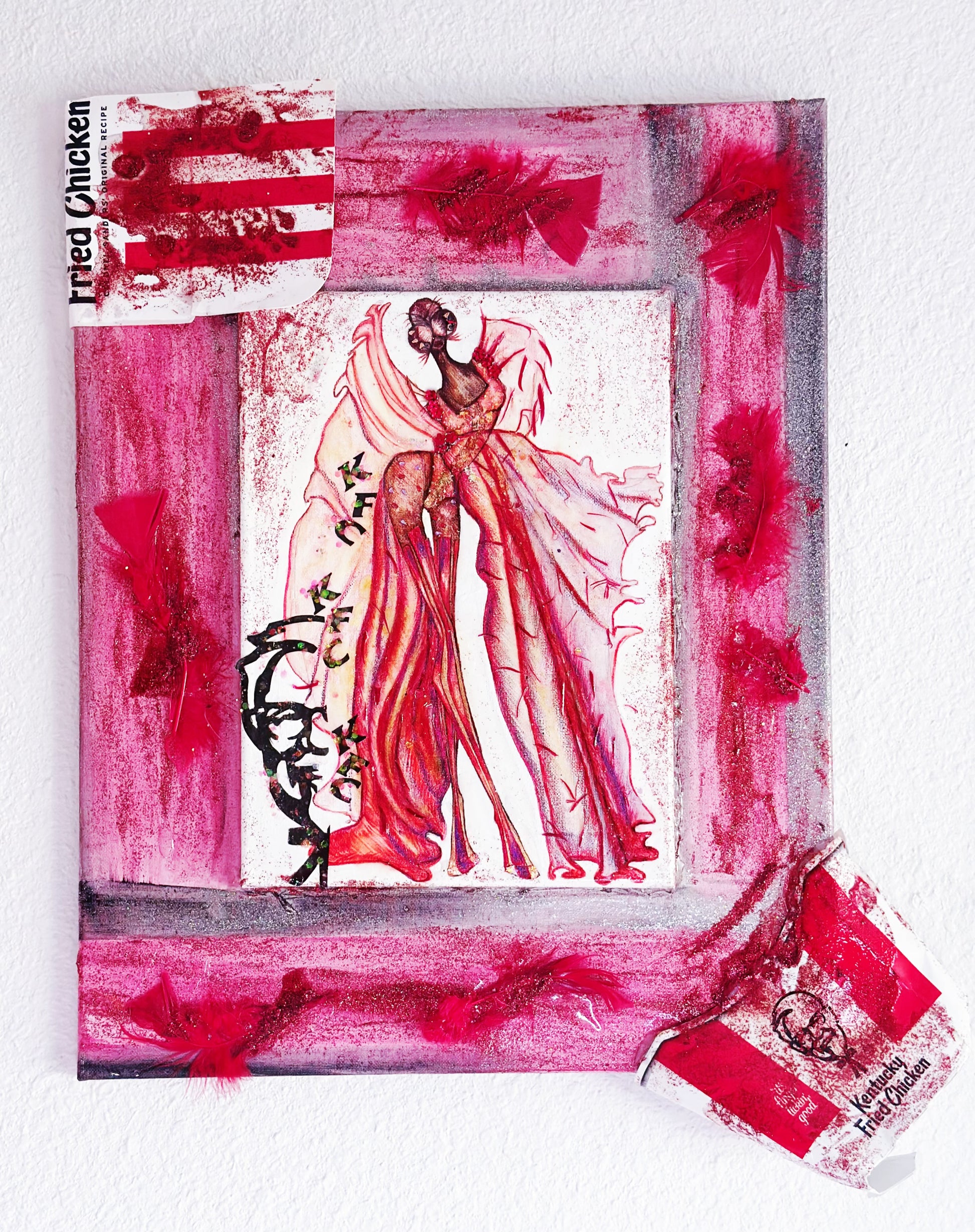 This original mixed-media piece features a hand-drawn couture illustration by Dina Kabdolla, styled in an ethereal gown created from authentic KFC packaging. The iconic red-and-white stripes, Colonel Sanders emblem, and textured chicken boxes are hand-cut, shaped, and layered into the composition. Vibrant crimson tones are accented with feathery textures and glitter, symbolizing purity, transformation, and freedom.