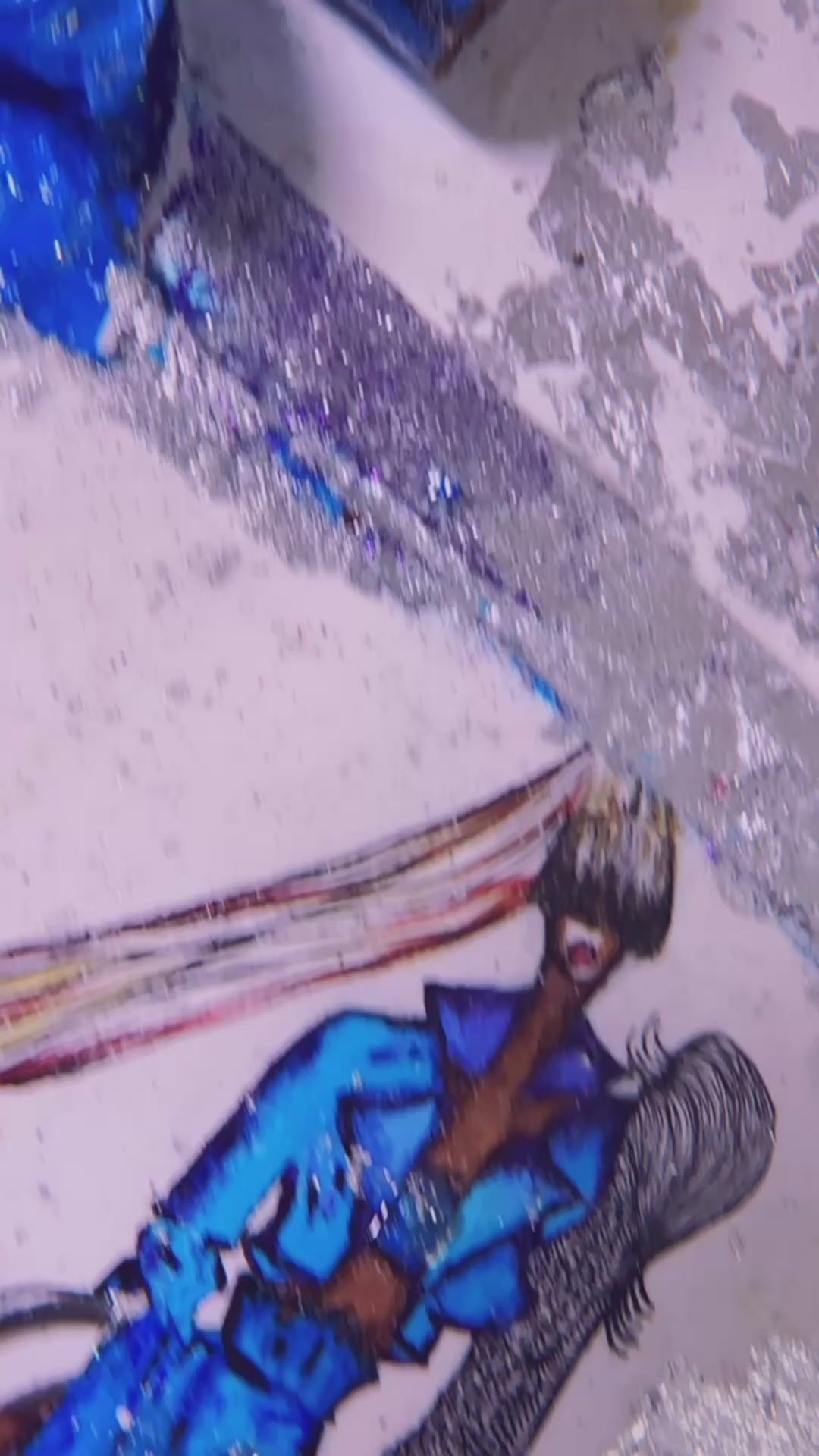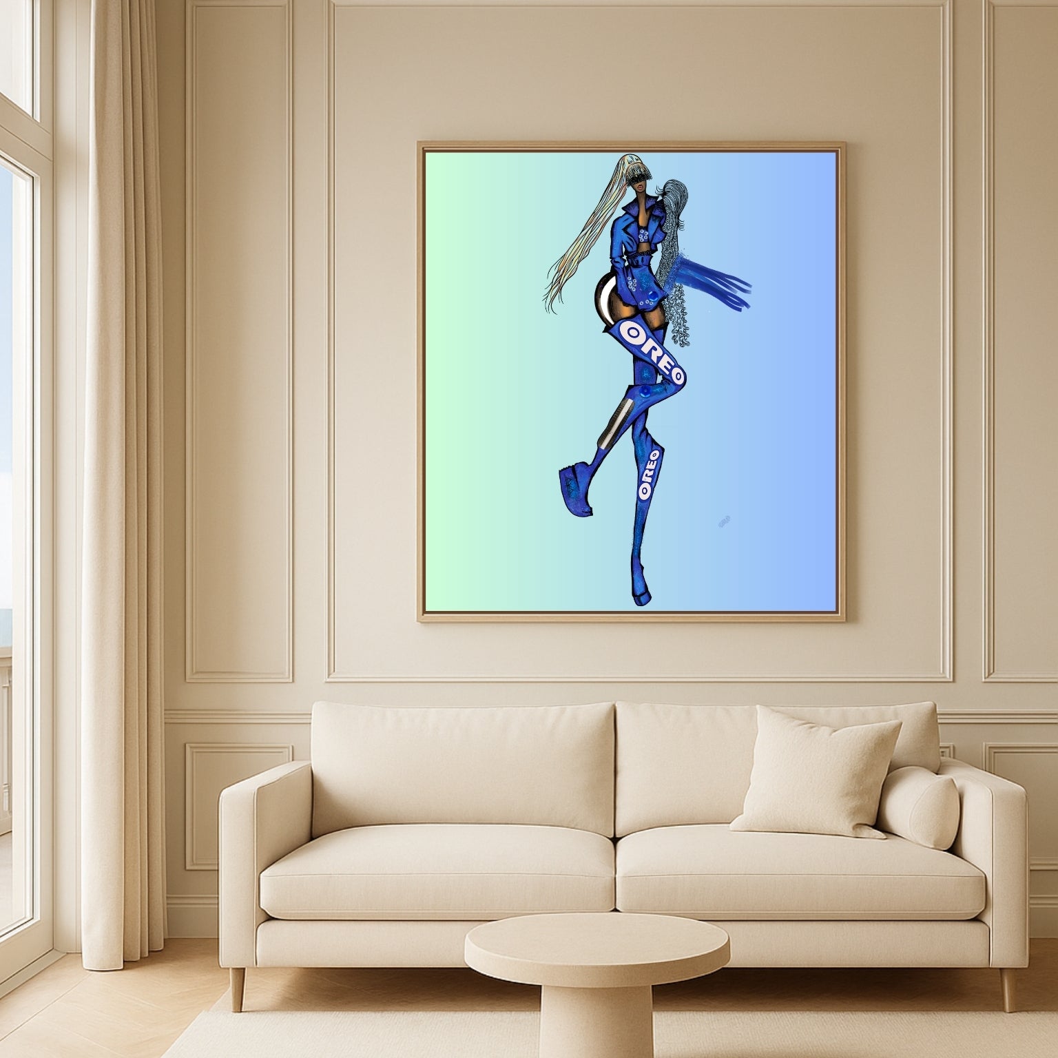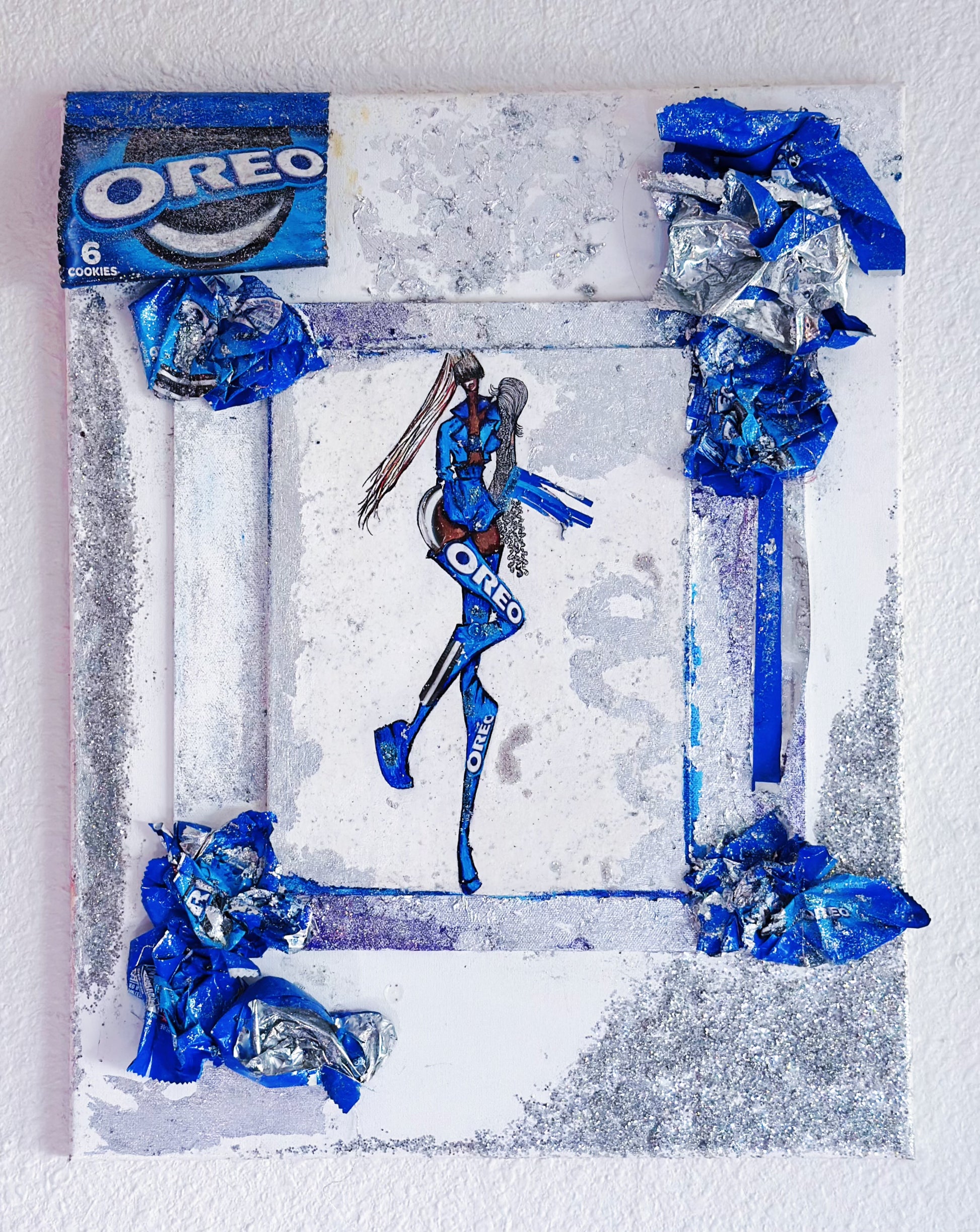 This original mixed-media work features a hand-drawn couture illustration by Dina Kabdolla, dressed in a high-fashion silhouette crafted from authentic Oreo cookie wrappers. Each wrapper has been hand-cut, shaped, and layered, with select elements crumpled for texture and set into a field of shimmering silver glitter and metallic pigments. The interplay of deep Oreo blue and reflective silver evokes both boldness and fluid elegance.