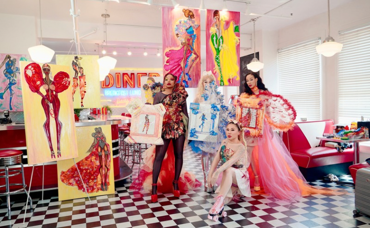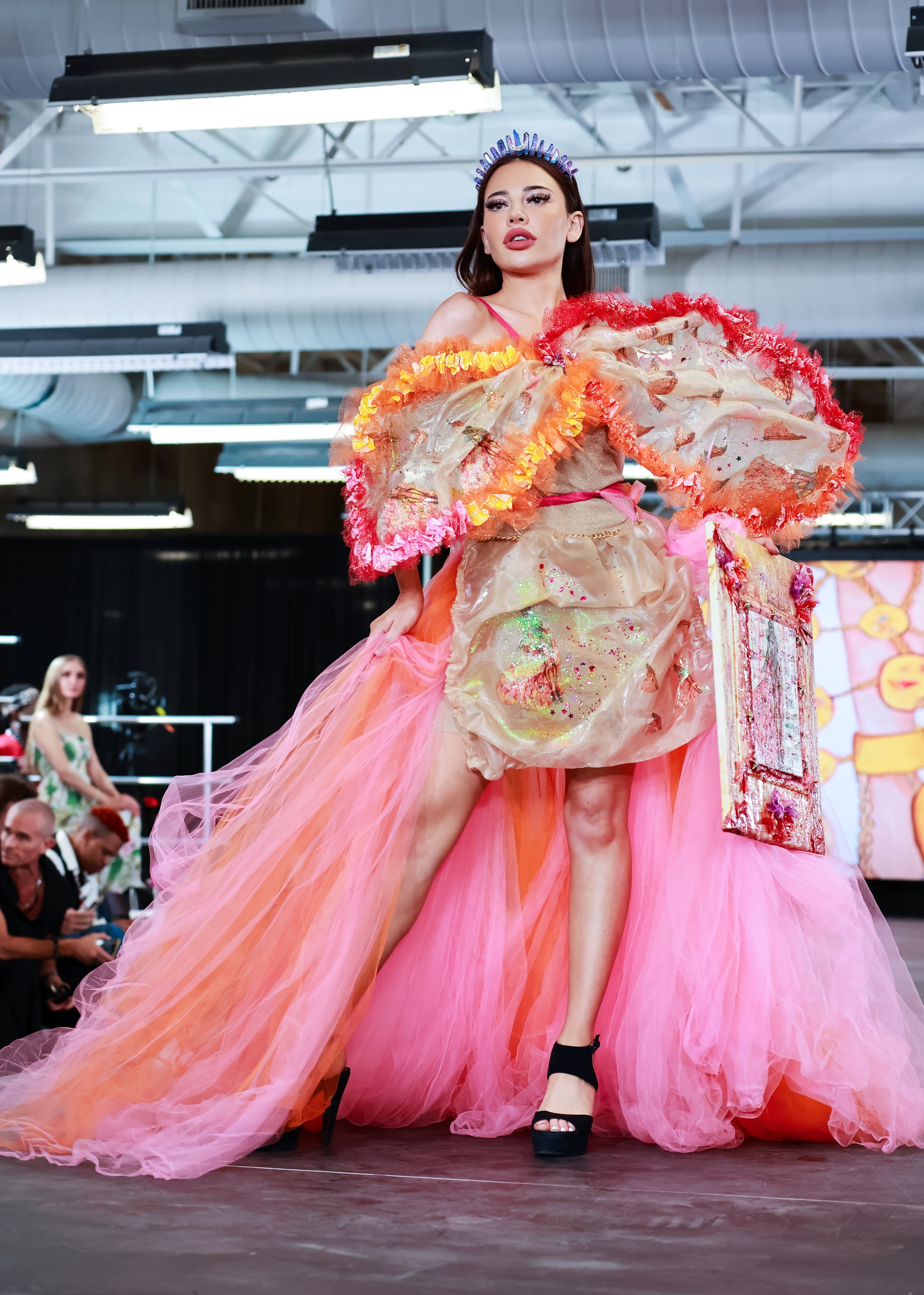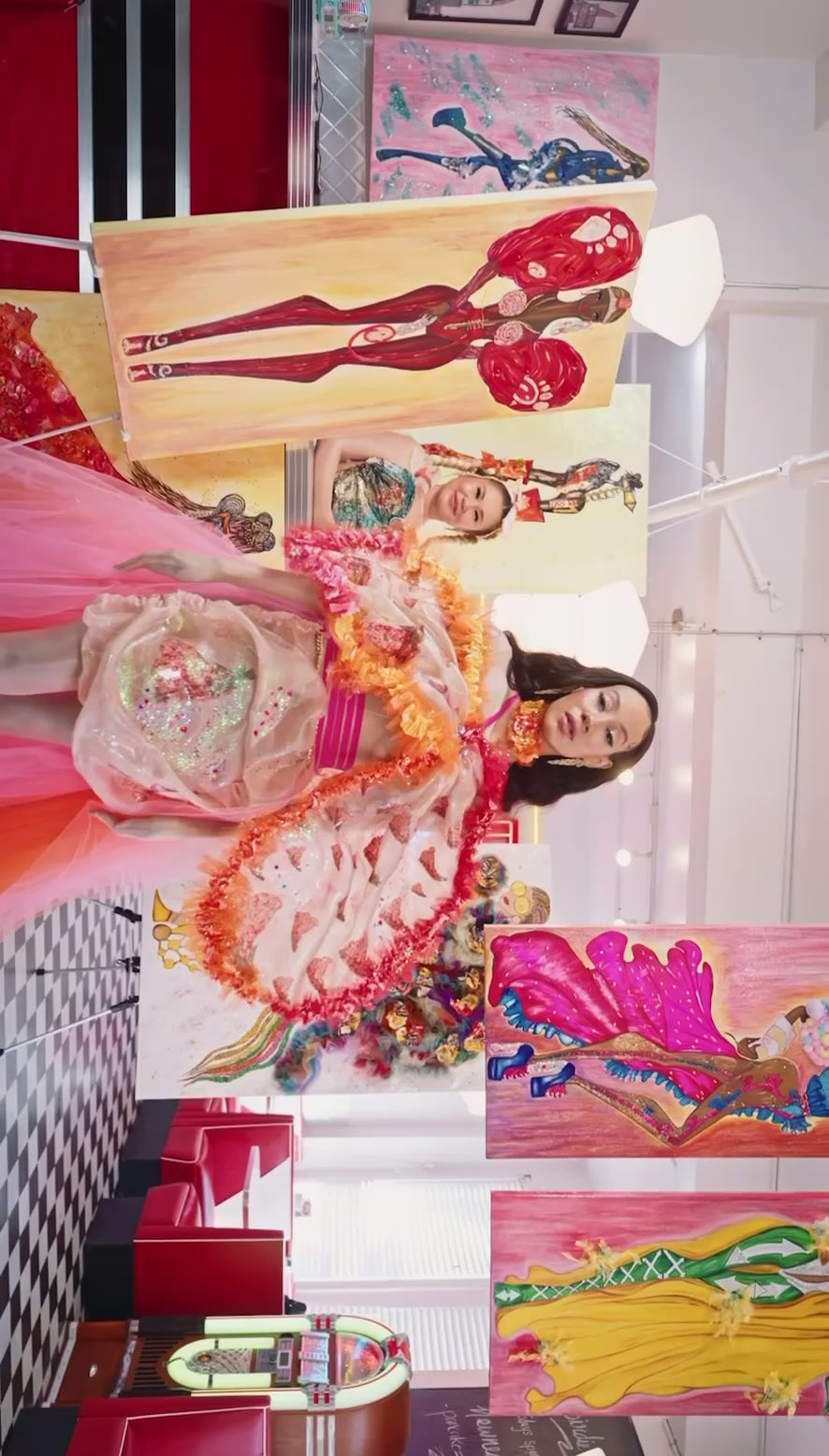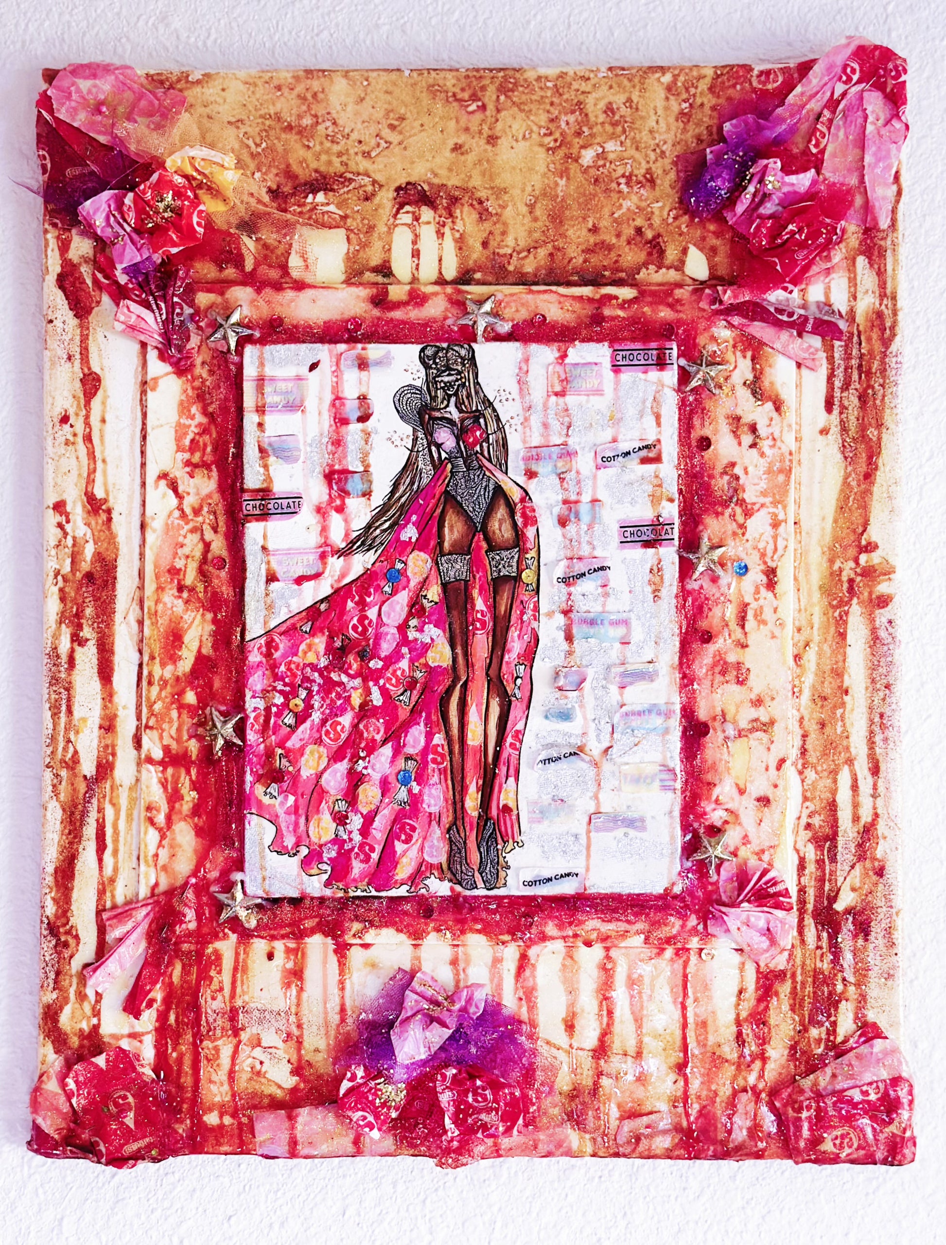 This original mixed-media work centers on a hand-drawn couture illustration by Dina Kabdolla, sealed beneath a high-gloss resin finish for lasting brilliance. Her gown is constructed from actual Starburst candy wrappers—melted, sculpted, and hand-shaped directly onto the canvas—creating flowing textures and dimensional draping unlike any other piece in the series. Layers of glitter resin, metallic pigments, and gemstone-like accents enhance her vibrant color story.