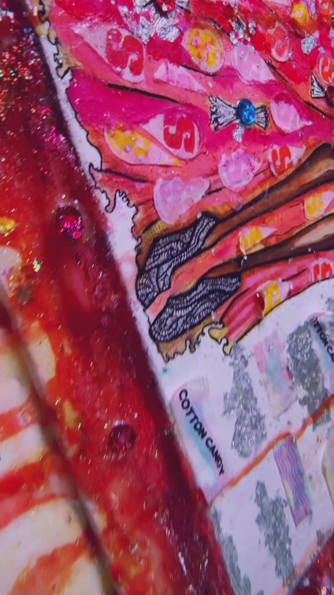 - Mixed media: resin, acrylic, oil, glitter, recycled candy wrappers, and embellishments