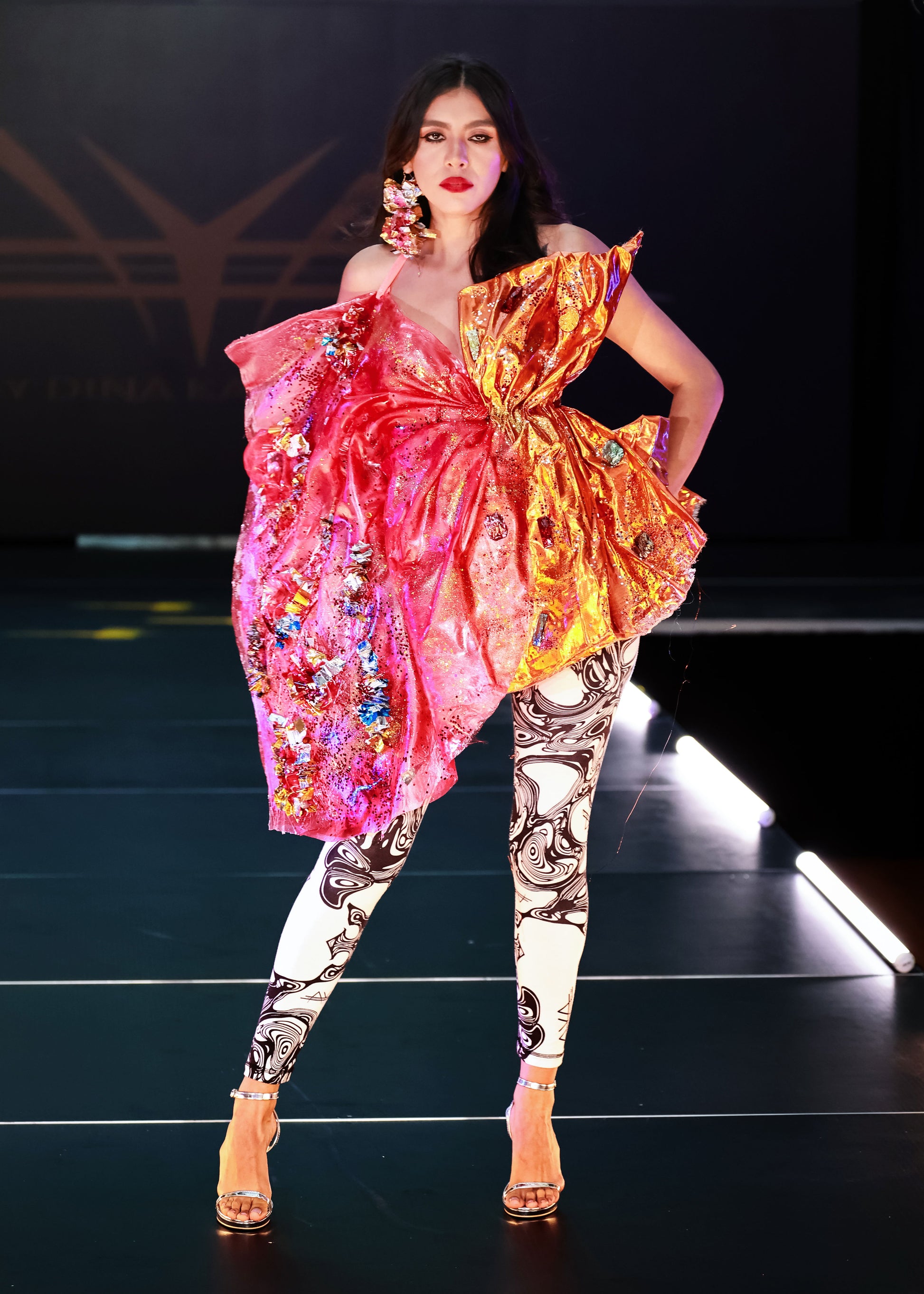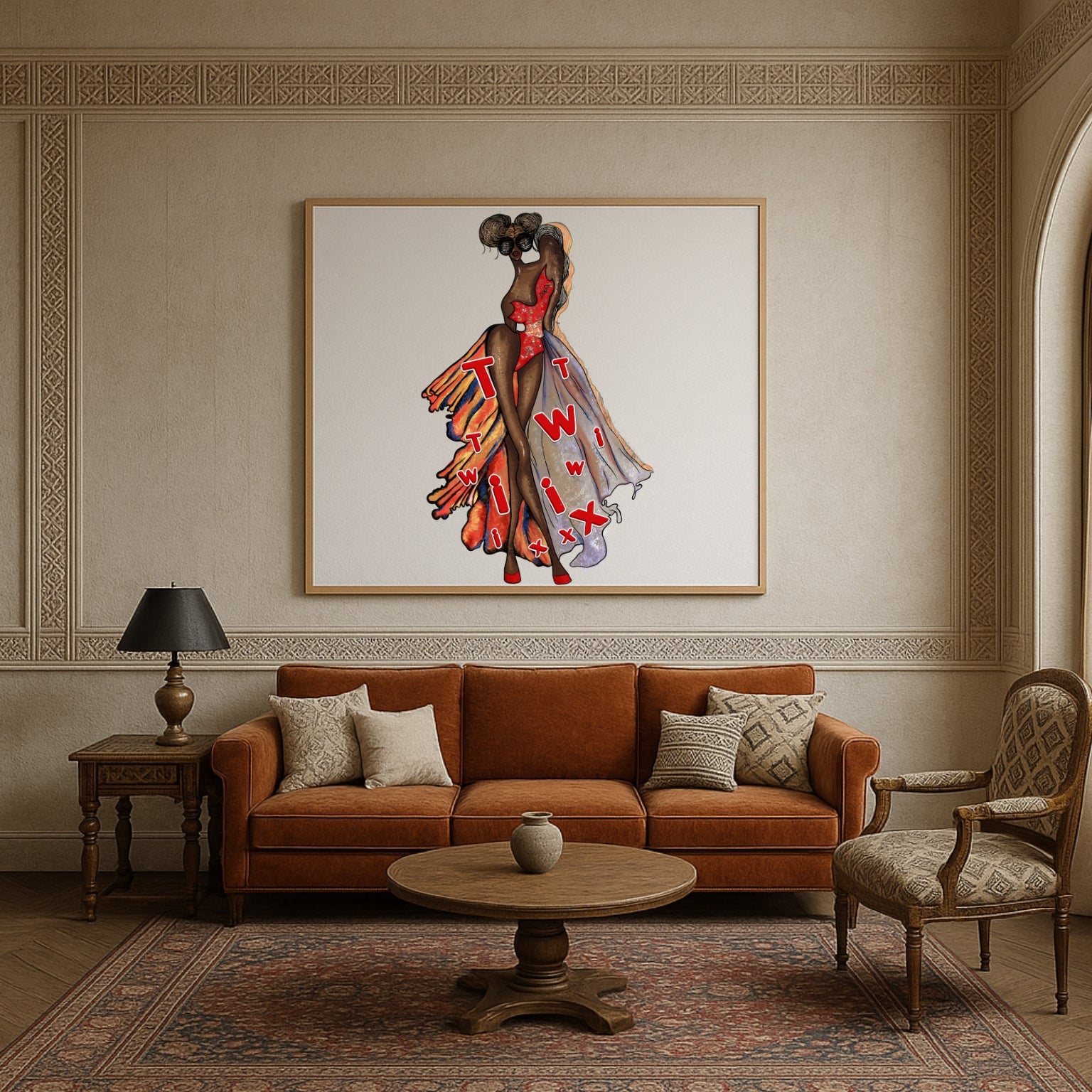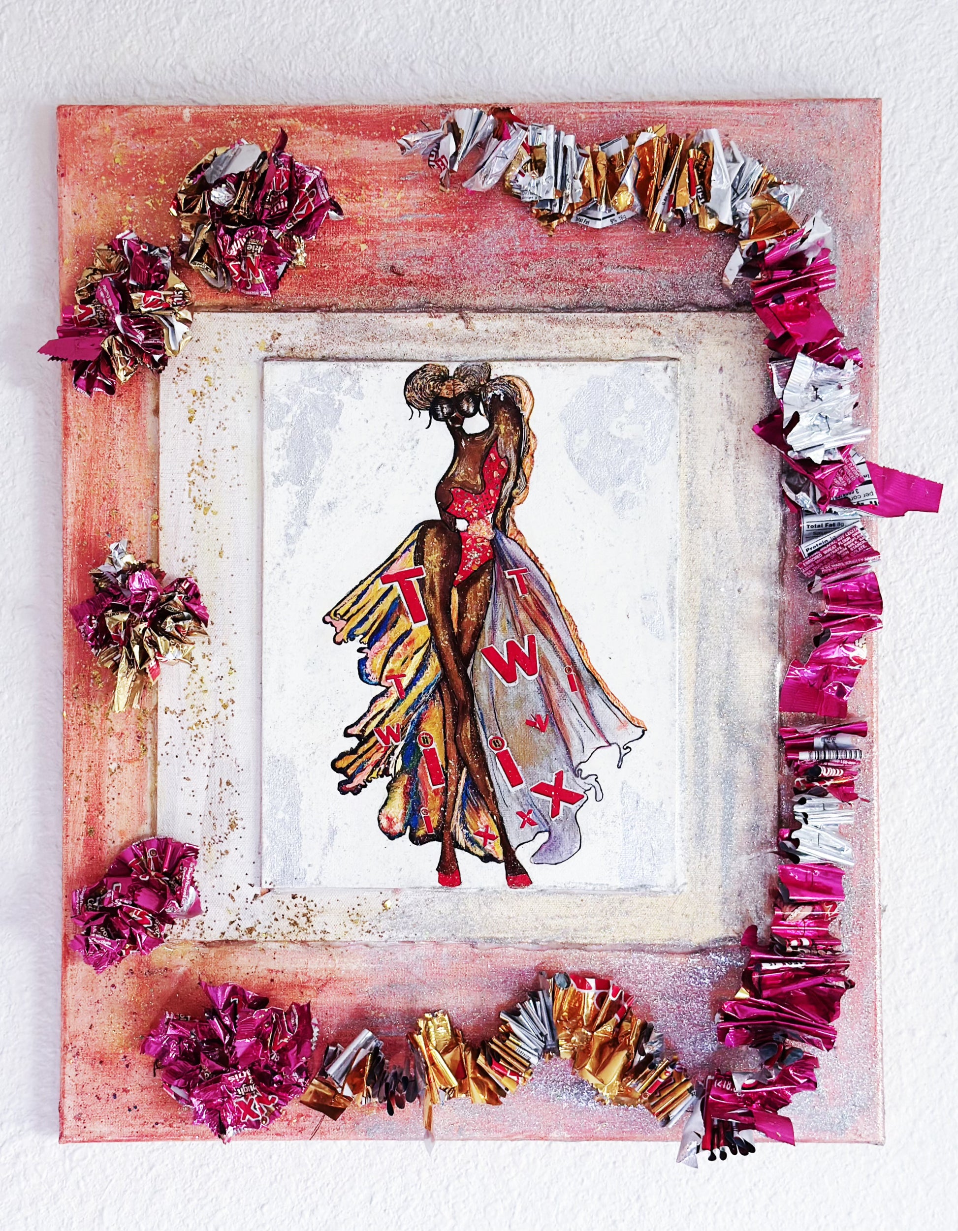 This original mixed-media work features a hand-drawn couture illustration by Dina Kabdolla, adorned in a sweeping gown crafted from authentic Twix candy wrappers. The metallic gold, deep chocolate brown, and vibrant magenta foils are hand-cut, shaped, and layered, transforming the familiar into fine art opulence.