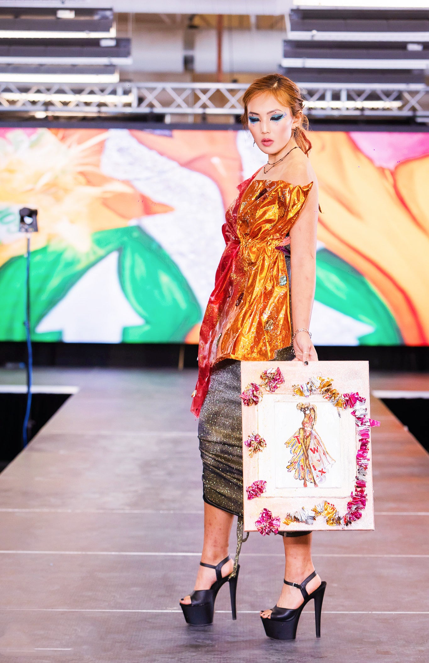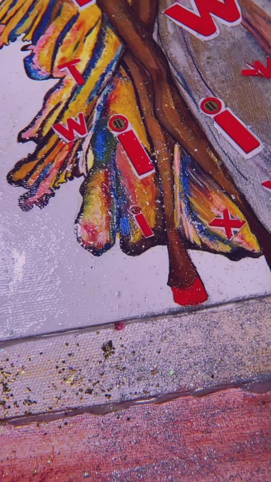 - Mixed media: acrylic, glitter, metallic pigments, recycled candy packaging