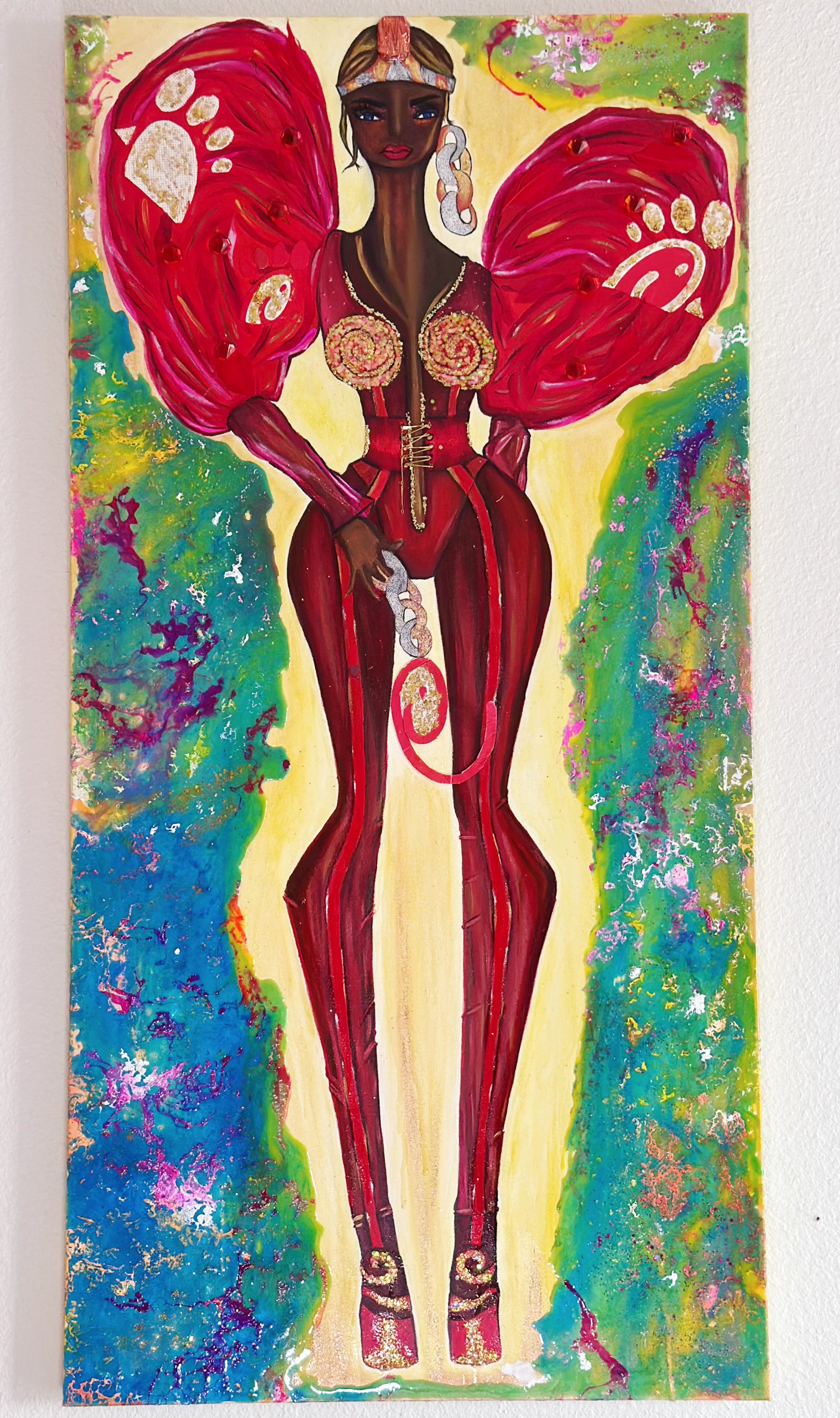 Queen Chicka — “Feed the Heart, Heal the Earth” is an original mixed media painting by Los Angeles eco-fashion artist AYA by DK (Dina Kabdolla). Created using reclaimed packaging, repurposed fabrics, recycled couture elements, and bold hand-painted detail, this artwork merges sustainable art, feminine power, and community storytelling.