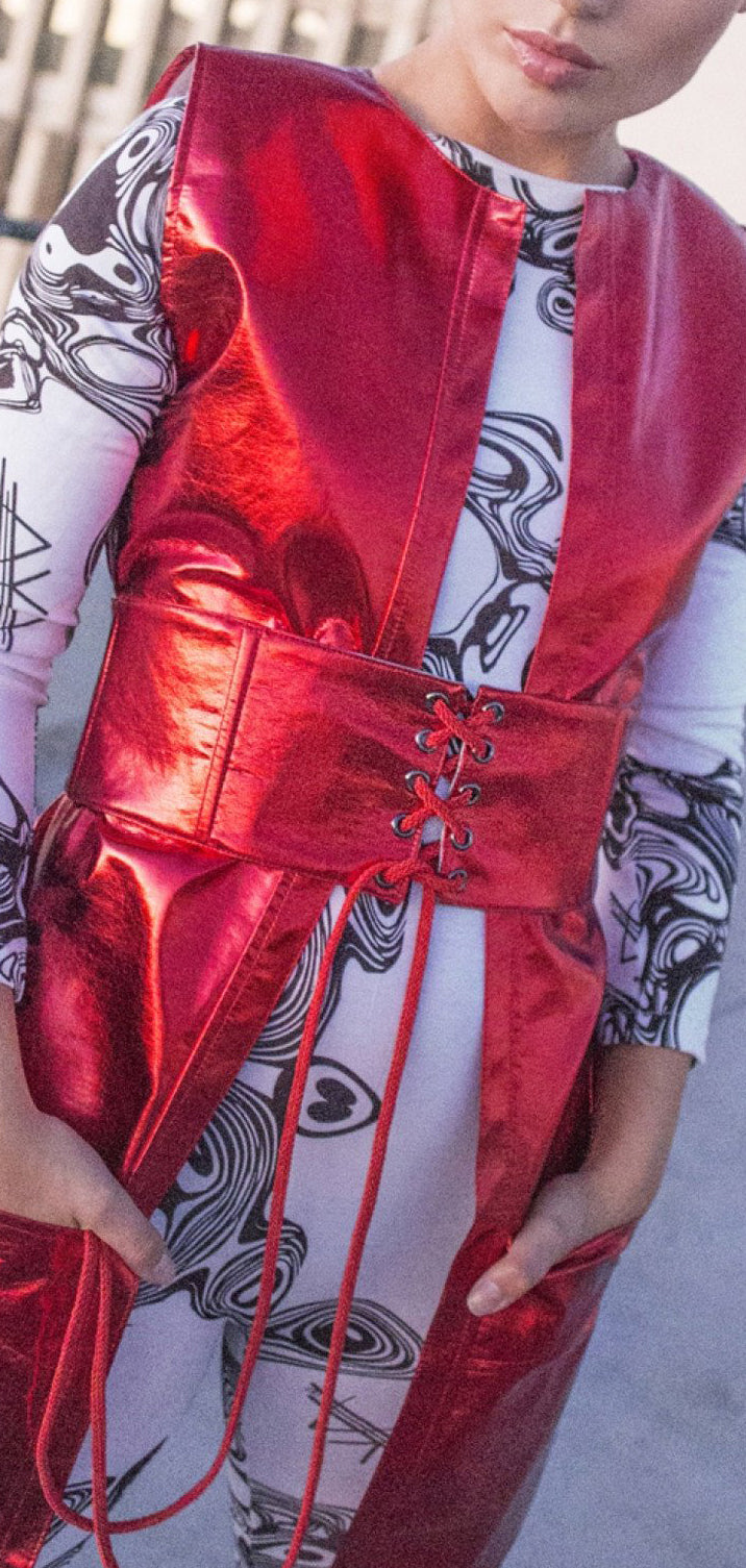 Ephrem Vest Jacket is exclusive artistic wearable piece. Structured forms asymmetrical, sleeveless design and sharp lines make up the DNA of AyA. Jacket has oversized fit , dropped armholes, and large patch pockets. Perfectly styled with Pèri Corset Belt. Spotted in Dreamingless magazine Issue 45, stay tuned to our SM platforms!