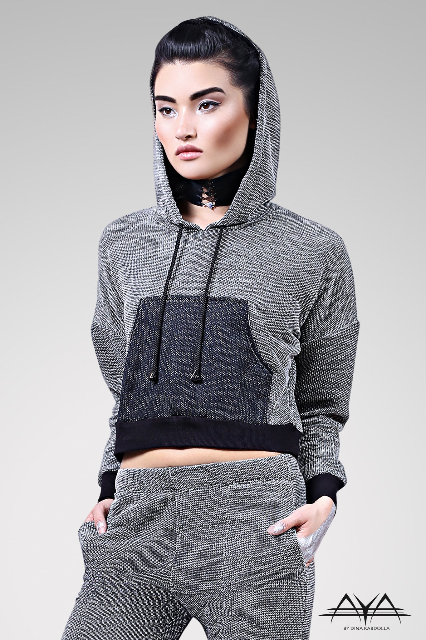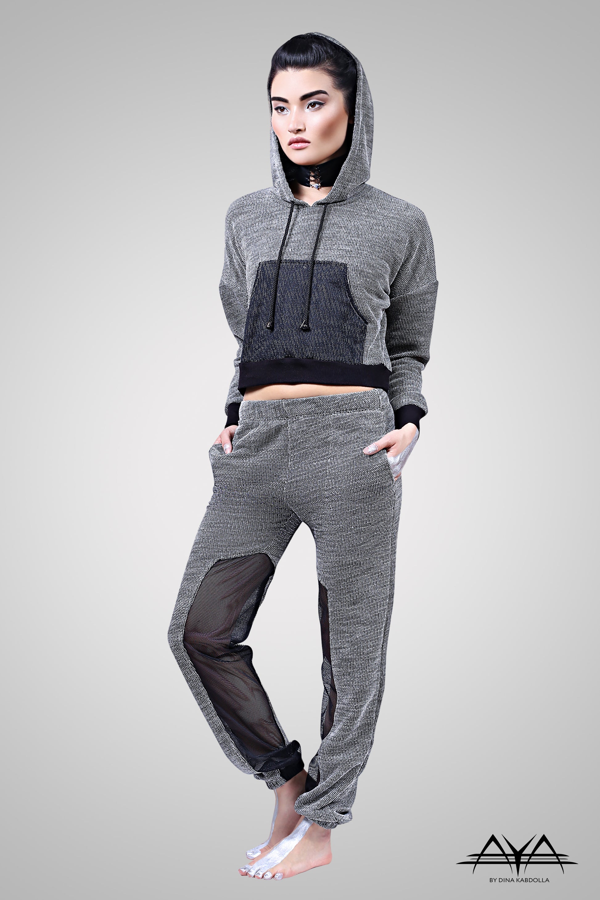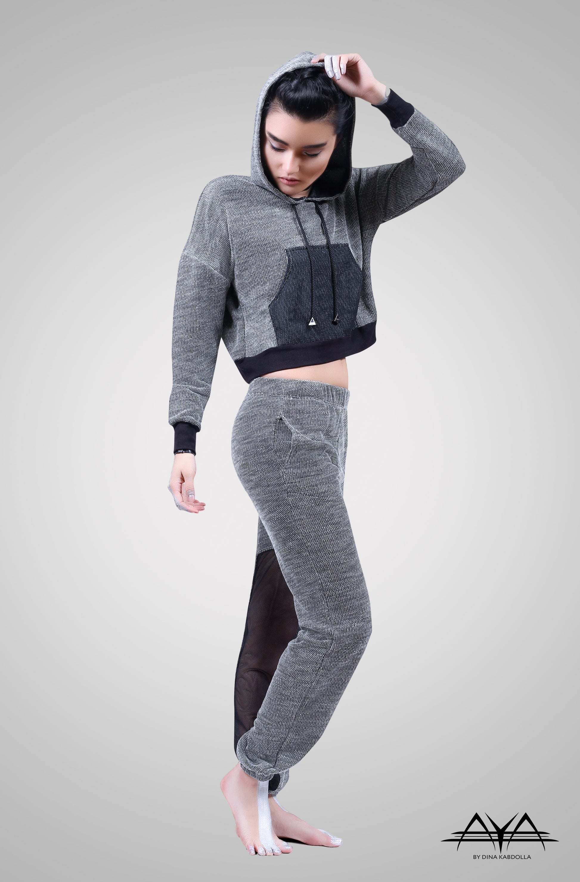 Marie Madeleine is a cropped pullover hoodie, designed in both Print and Solid Print. Both light weight with a mesh contrast on a kenguru pocket, Marie is a staple item in AYAs’ collection. Comes with fitted sweat pant with peek a boo mesh inner lining. Made from French Terry Fabric these bottoms accentuate the physique. Available in Pattern and Solid Print.