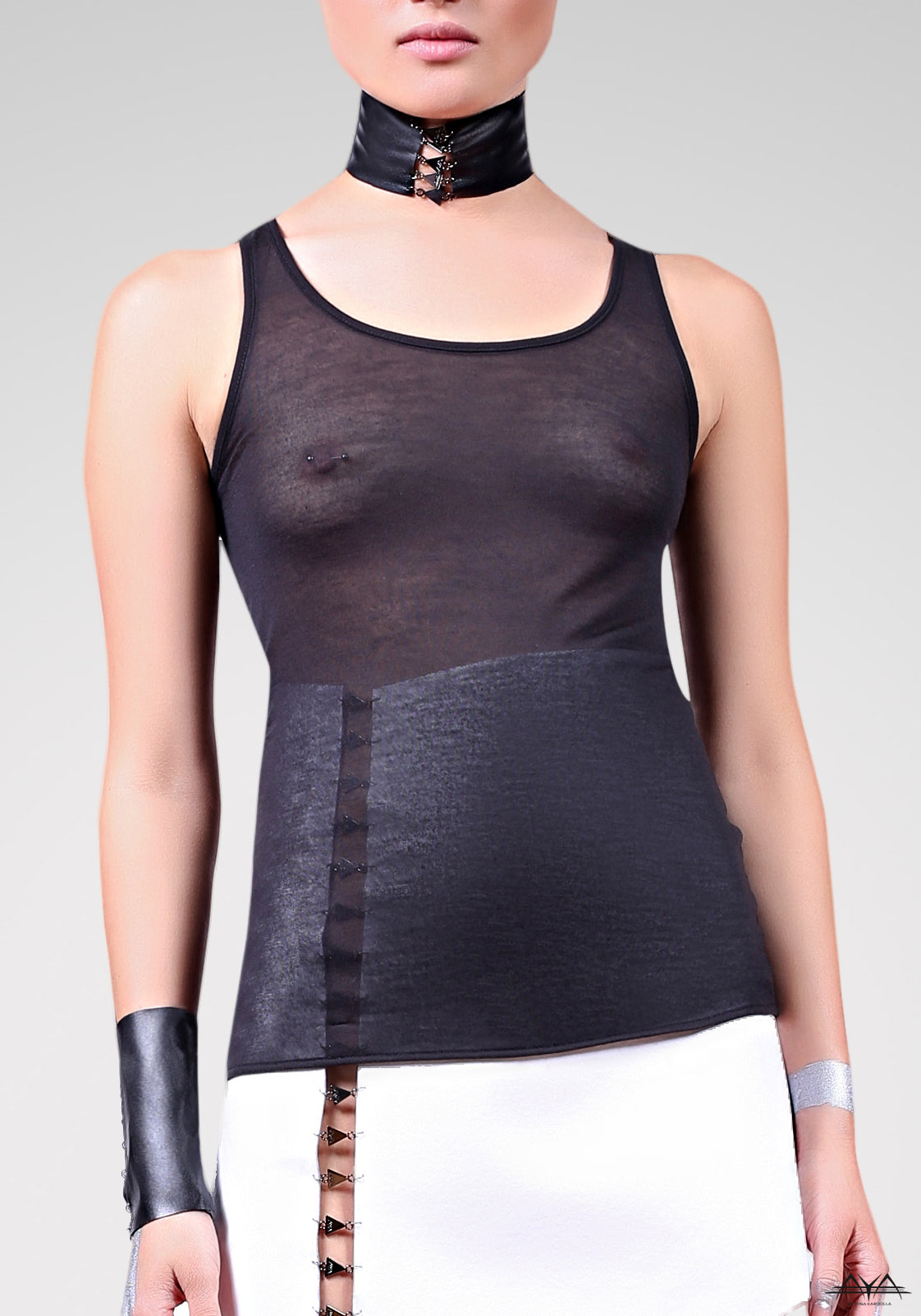 Yvonne sets the standard for what is to come. With a delicate front of Modal Silk and the upper back made of Mesh, this lightweight and form fitting sleeveless says it all when it comes to versatility. Available in Solid Black.